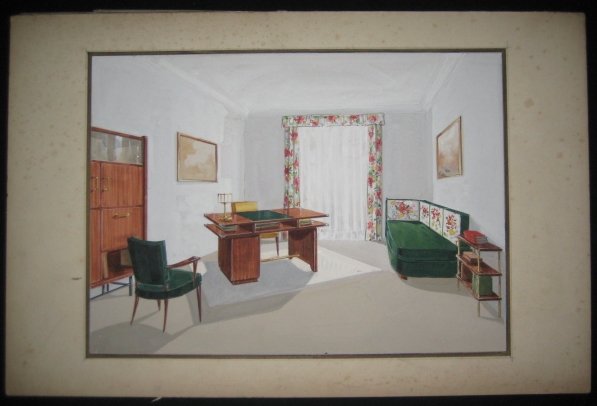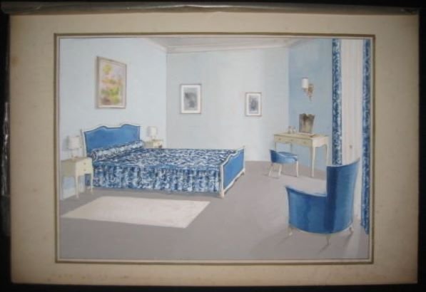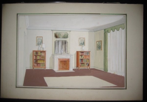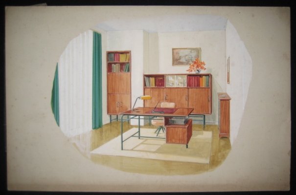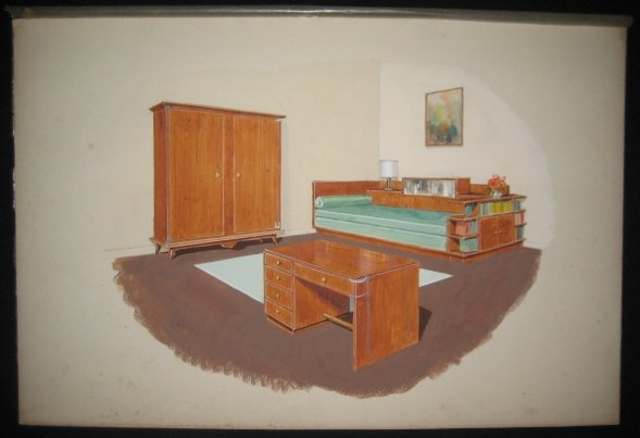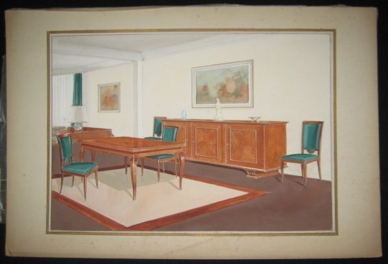 Sans lieu, sans date 1935 Sans lieu, sans date vers 1935-1945. Un ensemble de 49 dessins projets d'ébéniste ou décorateur (+2 petits). Planches sur carton, aquarellées de modéles de meubles mis en situations. Dimensions 39 x 27 cm hors marges - 50 x 32 cm avec marges, la plupart sous serpentes. Salons, salle à manger, bureaux, chambres. Certains meubles ont été inspirés de l'ébéniste suédois MEWESEN. Quelques rousseurs dans certaines marges néanmoins très bon ensemble.