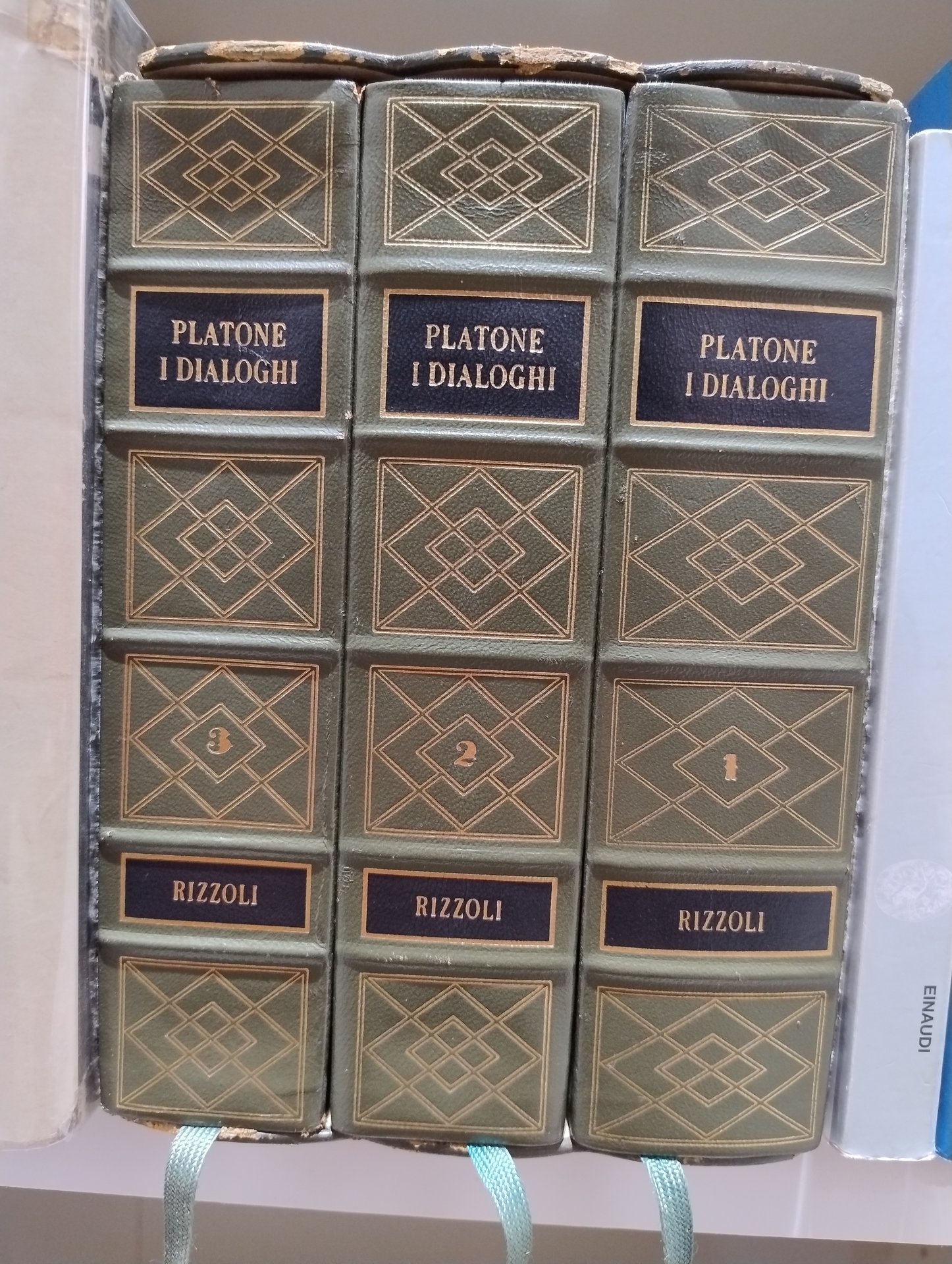 19,5x13, rilegatura in pelle, pp.1118-1107-1119. Taglio oro solo sul margine superiore. volumi in ottime condizioni, usura da scaffale e lieve fioritura sul cofanetto.