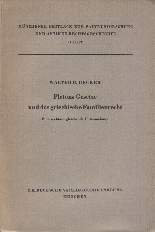 In-8°, pp. XVI, 363. (5), copertina editoriale. Normale patina del tempo alle pagine. Quasi completamente intonso. Ben conservato. "Münchener Beiträge zur Papyrusforschung und antiken Rechtsgeschichte", Veröffentlichungen des Instituts für Papyrusforschung an der Universität München. Vierzehntes Heft. Dall'indice: Erstes Buch. Das Eherecht. I. Kap. Stellung der Frau. 1. Der Kyriat; 2. Sonderrecht und Sitte. II. Kap. Eingehung der Ehe. 1. Die Ehe und der Staat; 2. Engyesis und Gamos. III. Kap. Ehehindernisse. 1. Das Ehehindernis der Blutsverwandtschaft; 2. Das Ehehindernis der Unfreiheit; 3. Das Ehehindernis mangelnder Epigamie; 4. Das Ehehindernis der Verwitwung; IV. Kap. Polygamie, Konkubinat, Ehebruch. 1. Polygamie; 2. Konkubinat; 3. Ehebruch. V. Kap. Eheliches Güterrecht. 1. Mitgift und Aussteuer; 2. Eheliches Vermögen und Sondervermögen; 3. Familienvermögen. VI. Kap. Auflösung der Ehe. 1. Das System des griechischen Eheauflösungsrechts; 2. Platonisches Recht; 3. Griechisches Recht; 4. Zusammenfassung und Vergleich. Zweites Buch. Verwandtschaft und vormundschaft. VII. Kap. Verwandtschaft. 1. Einleitung; 2. Gliederung der Verwandtschaft; 3. Verwandtschaft im öftentlichen Recht; 4. Verwandtschaft als soziologische Koinonie. VIII. Kap. Die Kinder. 1. Die Begründung des Kindesverhältnisses; 2. Die Rechtsstellung des Kindes; 3. Die Auflösung des Kindesverhältnisses. IX. Kap. Vormundschaft. 1. Berufung zur Vormundschaft; 2. Führung der Vormundschaft; Drittes Buch. Das Familiensachenrecht. X Kap. Erbrecht. 1. Des gesetzliche Erbrecht; 2. Das Testaterbrecht; 3. Der Erbgang. XI. Kap. Adoption. 1. Platonisches Recht; 2. Attisches Recht; 3. Außerattisches Recht; 4. Vergleich. XII. Kap. Die Erbtochter.