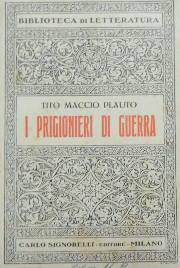 Tito Maccio Plauto, I prigionieri di guerra, introduzione, traduzione e note a cura di Pietro Salvadoretti, Carlo Signorelli Editore, Milano 1932, pp. 64, cm 15, br. ed. Collana Biblioteca di letteratura. Firma d’appartenenza all’occhiello. Segnatura di collocazione in calce alla prima di copertina. Minime fioriture, lieve ingiallitura della carta, per il resto ben conservato.