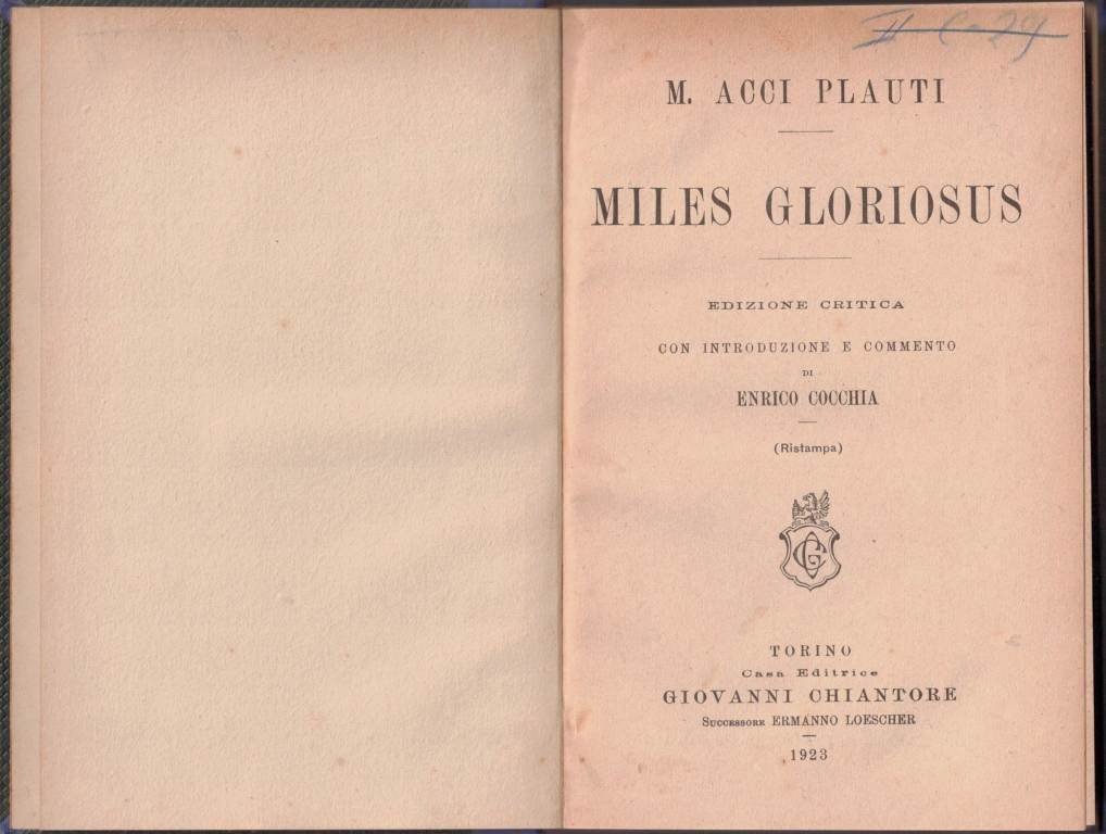 M. Acci Plauti (Tito Maccio Plauto, Titus Maccius Plautus), Miles gloriosus, edizione critica con introduzione e commento di Enrico Cocchia, Casa Editrice Giovanni Chiantore Successore Ermanno Loescher, Torino 1923, pp. XV, 186, cm 20, legatura coeva in mezza tela blu con titoli in oro al dorso e angoli. Testo in lingua latina con introduzione, commento e apparati in lingua italiana. Segnatura di collocazione a margine del frontespizio. Minima brunitura della carta, per il resto perfetto.