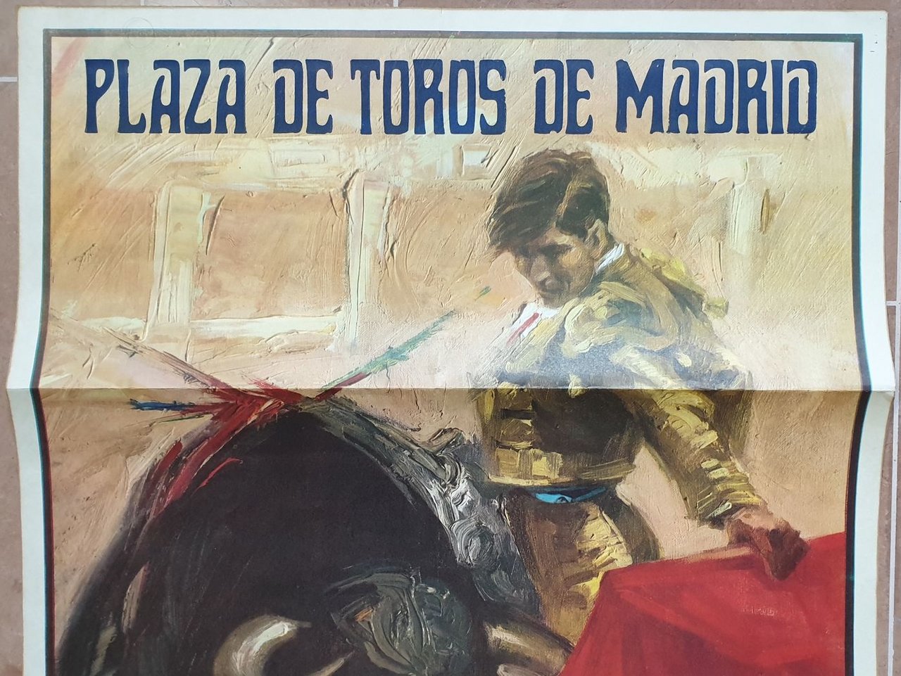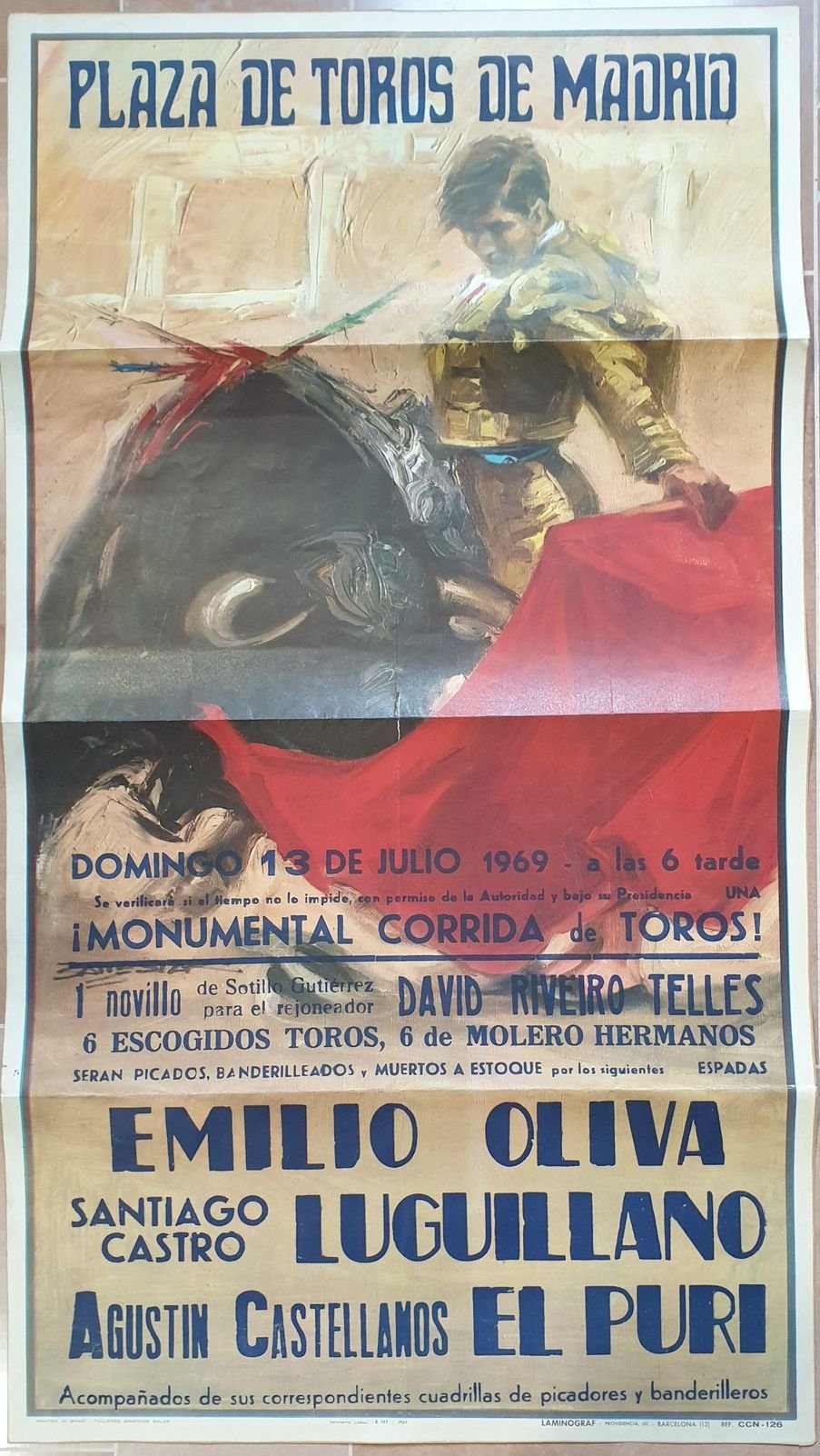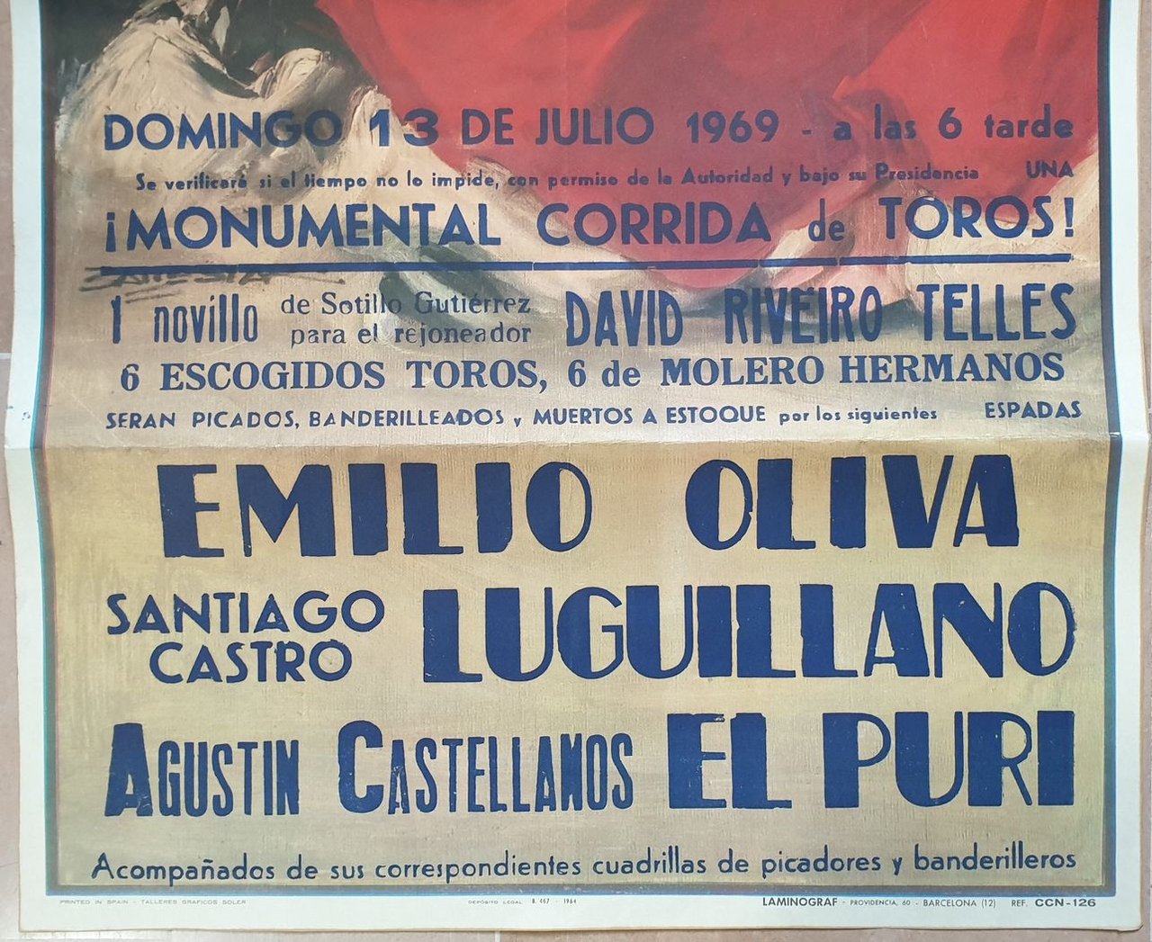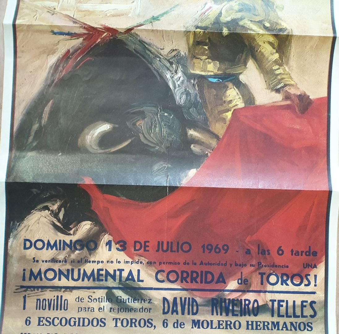 Manifesto originale della Corrida del 13 luglio 1969. I toreros: David Riveiro Telles, Emilio Oliva, Santiago Castro, Lugulliano, Agustin Castellanos El Puri. In ottime condizioni, piegature. In folio. cm 52,5x94. Original poster of Corrida of 13th of july 1969. The toreros: David Riveiro Telles, Emilio Oliva, Santiago Castro, Lugulliano, Agustin Castellanos El Puri. In very good conditions, foldings. In folio. cm 32,5x43.