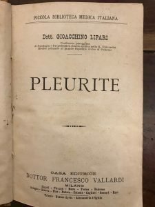 [vt] Contiene: Divisione e classificazione delle pleuriti, patogenesi e batteriologia, etiologia, anatomia patologica, sintomatologia, segni fisici, durata e decorso, complicazioni, esiiti, postimi, diagnosi, prognosi, cura. Lievi bruniture ai tagli e alle ultime pagine ma nel complesso molto buono. Pagg. 260. Cartonato coevo. Mis mm 180x115