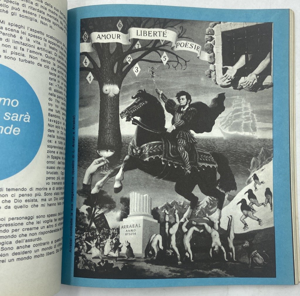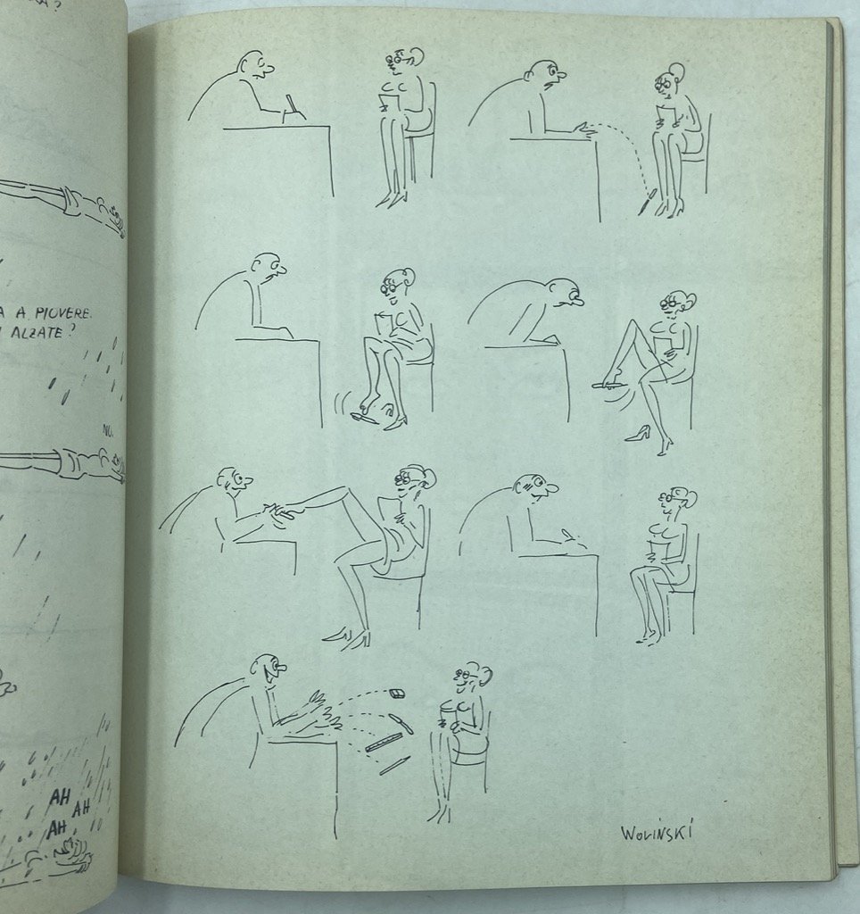 Sette fascicoli in brossura editoriale illustrata, cm 20 x 17.5, ciascuno composto di 140 pagine illustrate in nero e bicromia. Complessivamente buono stato di conservazione, con leggeri segni d'usura sui dorsi e un paio di pagine scollate dal dorso nel numero 3. Tutto il pubblicato di questa rivista dedicata all'erotismo, all'umorismo e in generale alla liberazione sessuale, versione italiana dell'omonimo periodico francese nato da una costola di Planète di Louis Pauwels. L'edizione francese, col sottotitolo «La revue qui décomplexe», diretta inizialmente da Alex Grall, poi dal Pauwels e infine da Jacques Mousseau, produsse 37 numeri tra il 1966 e il 1970, incontrando non pochi problemi con la censura. La versione italiana comparve nel febbraio 1969, diretta da Valerio Miroglio con l'ausilio di un comitato di redazione composto da Gian Renzo Morteo, Franco Giachino Nichot e Adriano Spatola, cui si aggiunse dal secondo numero Fernanda Pivano; il primo numero andò incontro a censura e in tutto furono pubblicati 7 fascicoli, fino a novembre 1969. L'edizione italiana riprese in gran parte articoli, temi e impostazione grafica della francese, privilegiando illustrazioni tra il surreale e lo psichedelico; redazionali e articoli firmati da Miroglio, Spatola, Nico Orengo, Paolo Fossati, Roberto Lupo, Guido Viola, Pierre Restany, Roland Topor, Pierre Hahn, Robert Sheckley. Tra gli artisti che figurano nella rivista troviamo Leonor Fini, Arrabal, Mel Ramos, Wesselman, Felix Labisse, Gisela Breitling, César, Bellmer, Didier Moreau, Claudine Wick, Molinari, Tony Muzlinger; tra i fotografi Stigadam; Émile Perauer, Frédéric Barzilay, Ica Vilander, Bernard Houplain, Daniel Barreau, Lucien Clergue; tra i fumettisti Wolinsky, Legrand, Pichon, Loup.