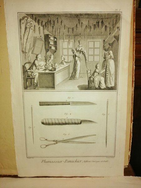 In-folio (39,5 cm) (2) V c. (di tav.). Cartoncino con carta marmorizzata. Tavole incise da Benard. Prime pagine con le prime sei carte con strappo senza perdita di testo. Proviene da Encyclopédie ou Dictionnaire raisonné des sciences, des arts et des métiers, opera enciclopedica in 35 voll., di cui 11 di tavole, pubblicata a Parigi tra il 1751 e il 1772. Diretta da D. Diderot, intendeva esporre i progressi compiuti dall'umanità in tutti i campi, con particolare riguardo alla tecnica. Le voci furono scritte da letterati, specialisti, medici e ingegneri, tra cui J.-B. D'Alembert, Voltaire, C. Montesquieu, J.-J. Rousseau, E. Condillac. "Recueil de Planches, sur les sciences, lse arts liberaux, et les arts mechaniques, avec leur explication. Septieme livraison, ou huitieme volume. 254 planches. A Paris, chez Briasson, rue Saint Jacques, à la Science, 1771". French language. Lingua francese