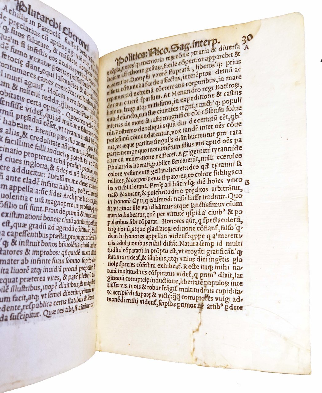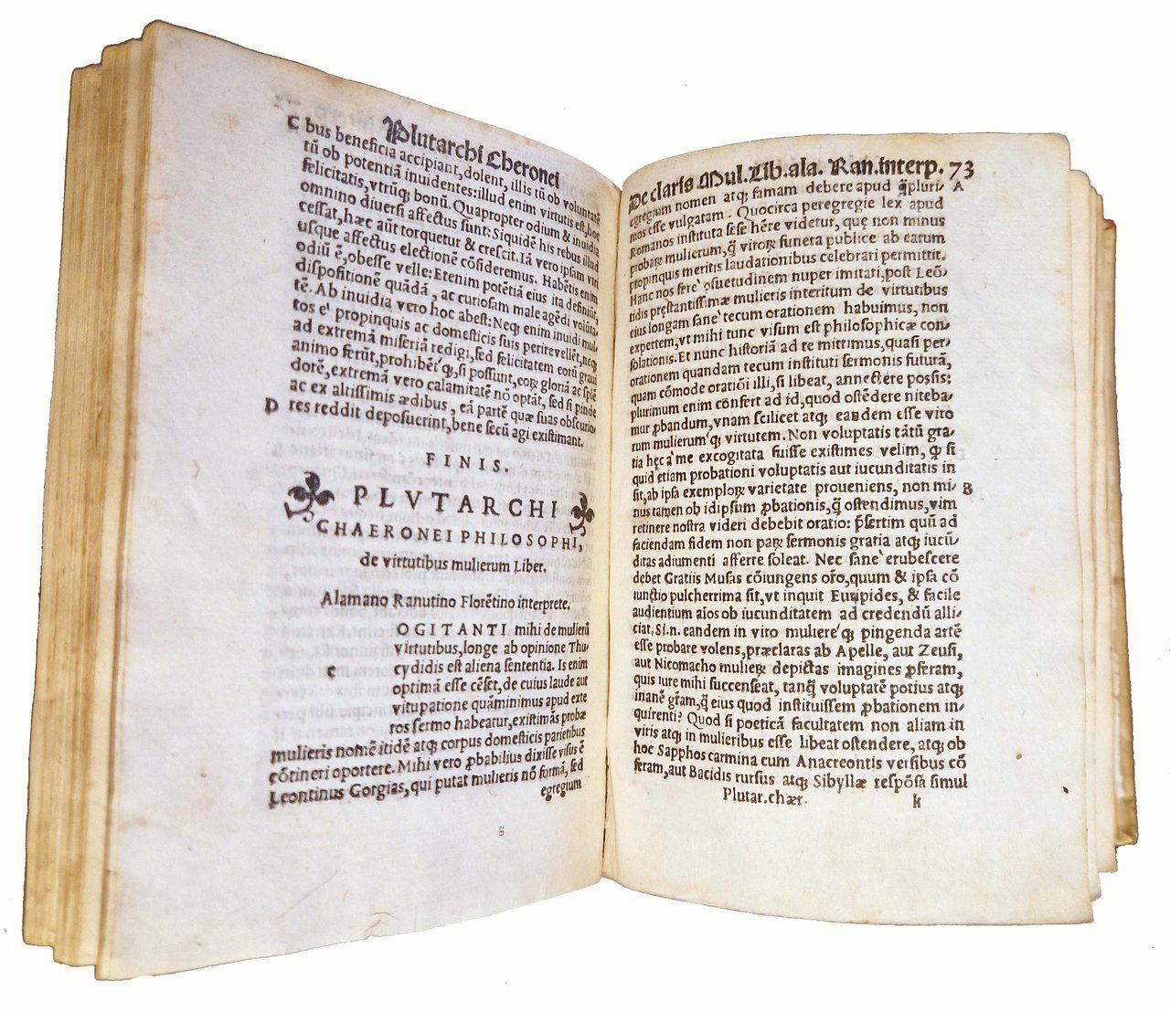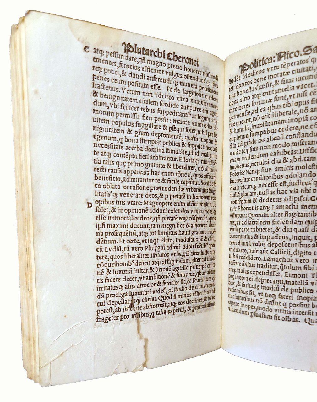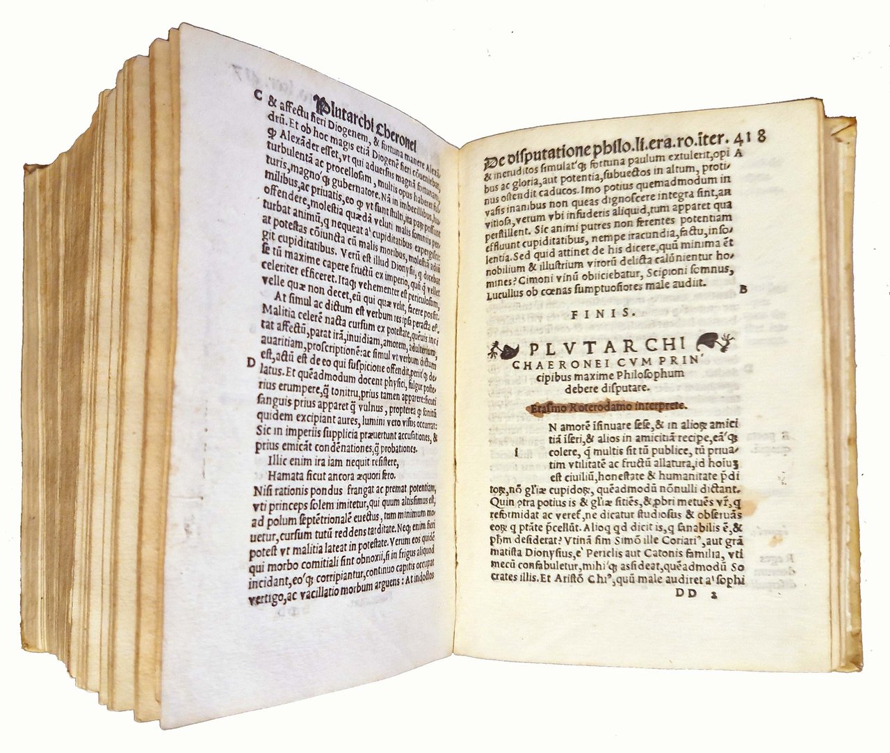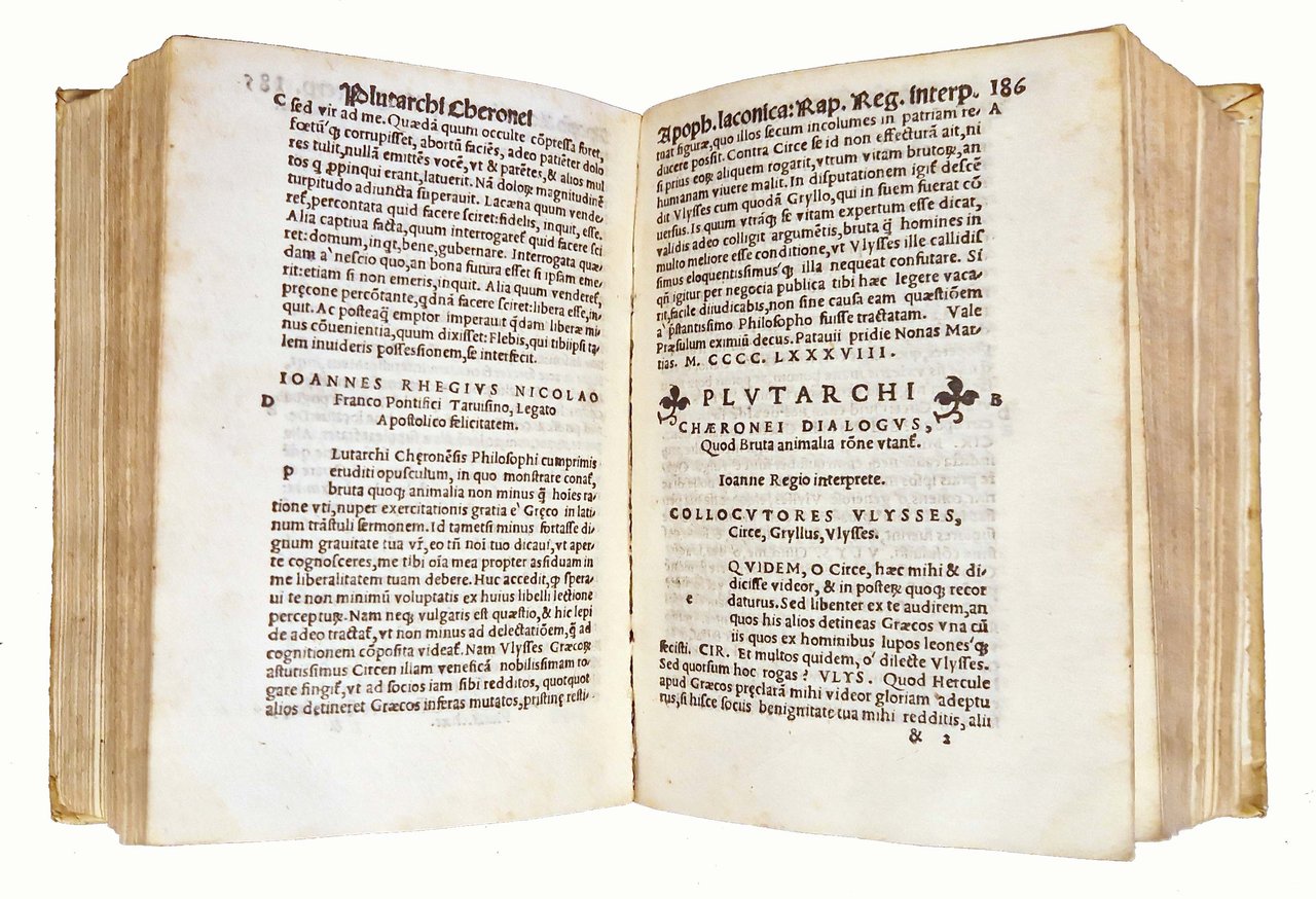 in-8°, 154x102 mm, leg. in pergamena rigida, dorso liscio con titolo a caratteri dorati su tassello in pelle; carte [32], 536. Frontespizio in ricca cornice xilografica, ornata da puttini e animali grotteschi, con marca tipografica (gatto con topo in bocca) in alto nella cornice stessa; marca xil. al colophon (in un cerchio sormontato da corona gatto con topo in bocca; iniziali MS). Note tipografiche dal colophon. Testo in Latino, preceduto dall'Index. Vasta raccolta degli Opuscula di Plutarco, con interpretazioni e commenti di illustri umanisti, tra cui Erasmo da Rotterdam; in questo esemplare tutti i testi commentati da Erasmo presentano antiche cancellature ad inchiostro sopra le scritte "Erasmo Roterodamo interprete". Plutarco (ca. 46-ca. 120), scrittore e filosofo greco antico, vissuto sotto l'Impero Romano, studiò ad Atene e fu fortemente influenzato dalla filosofia di Platone; nato e morto a Cheronea, in Beozia. Rif.: IT\ICCU\BVEE\006607. CNCE 32309. OCLC, 797718318. Cond.: Segni d'uso al dorso (abrasioni e piccole mancanze al dorso, al titolo e alla cornice dorata). Carte pulite. Presenza di antica cancellatura ad inchiostro al frontespizio, sotto al titolo. Antica sovrapposizione di una striscia di carta in fondo al frontespizio, a copertura di una antica iscrizione d'appartenenza manoscritta ad inchiostro (che si intravede in controluce). Piccolo strappo al margine inferiore della carta 30, quasi sicuramente originale (dovuto a piegatura difettosa della carta in fase di stampa), con limitatata perdita di alcune lettere, senza penalizzazione nella lettura del testo. Presenza, come già indicato, di antiche cancellature ad inchiostro sopra le scritte "Erasmo Roterodamo interprete". Esemplare comunque decisamente buono.
