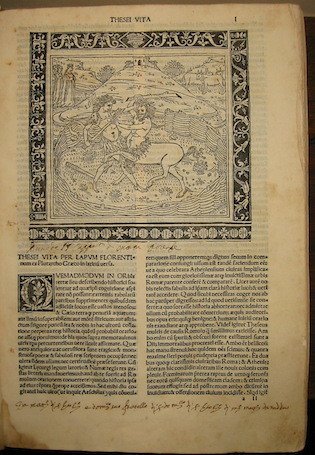 8vo (cm. 29,7), 1 c.nn., 145 cc., 151 cc., ultima bianca assente. Grande incisione xilografica all’inizio del primo Libro (identica a quella dell’edizione del 1491) e bei capilettera ornati. Legatura in piena pergamena antica con nervi e titolo ms. al ds. Capitelli e carte di guardia rinnovati. Timbro di biblioteca privata sulla prima carta, sottolineature e qualche annotazione di antica mano. Fori di tarlo al margine interno delle prime sette carte e altri, assai piccoli, su molte carte del secondo Libro. Nel complesso, esemplare fresco e in buono stato di conservazione. Raro. Sander, 5784. Br. Libr., p. 528. Non in Adams. Provenienza: Biblioteca Conte Berettini.