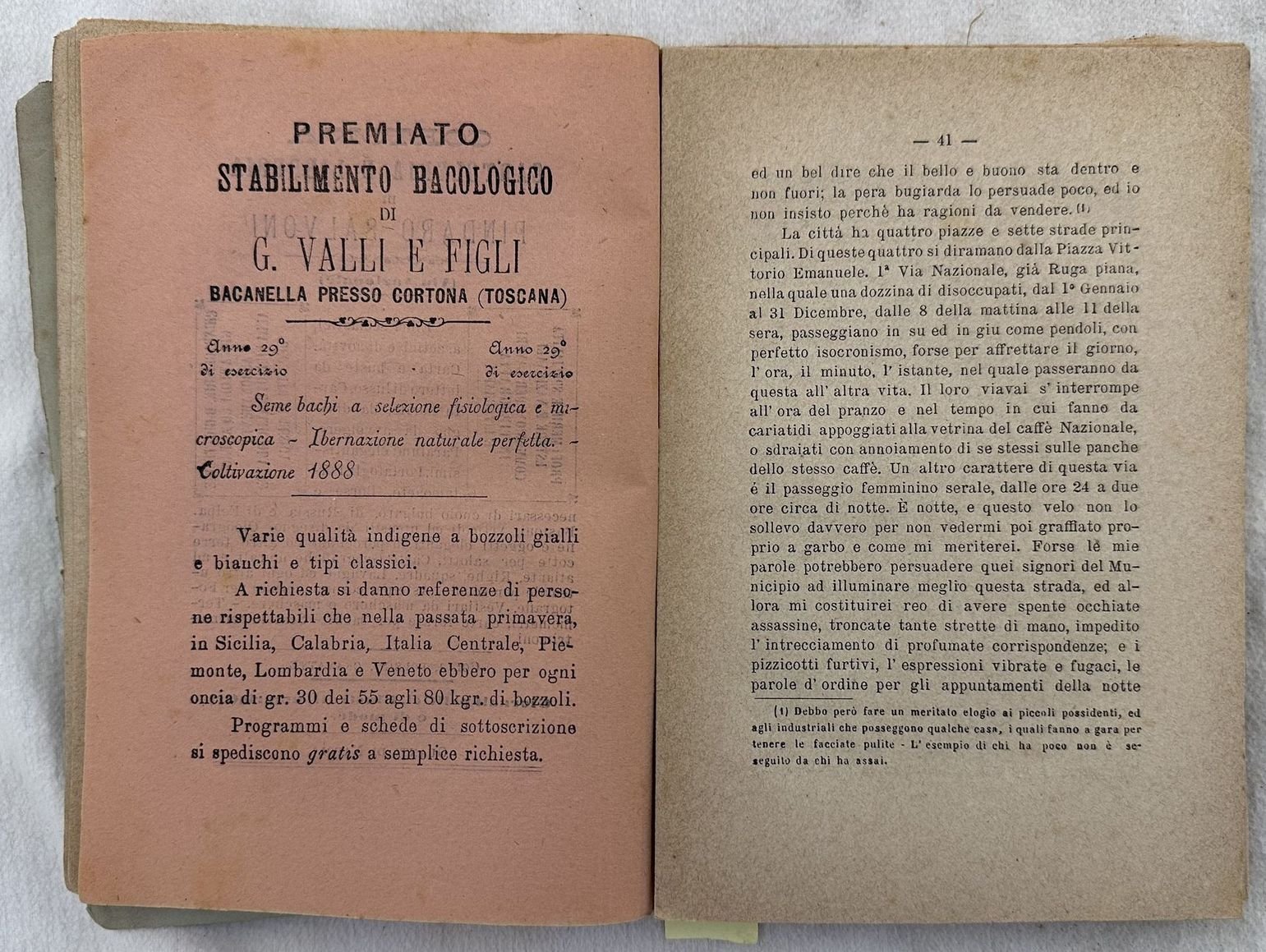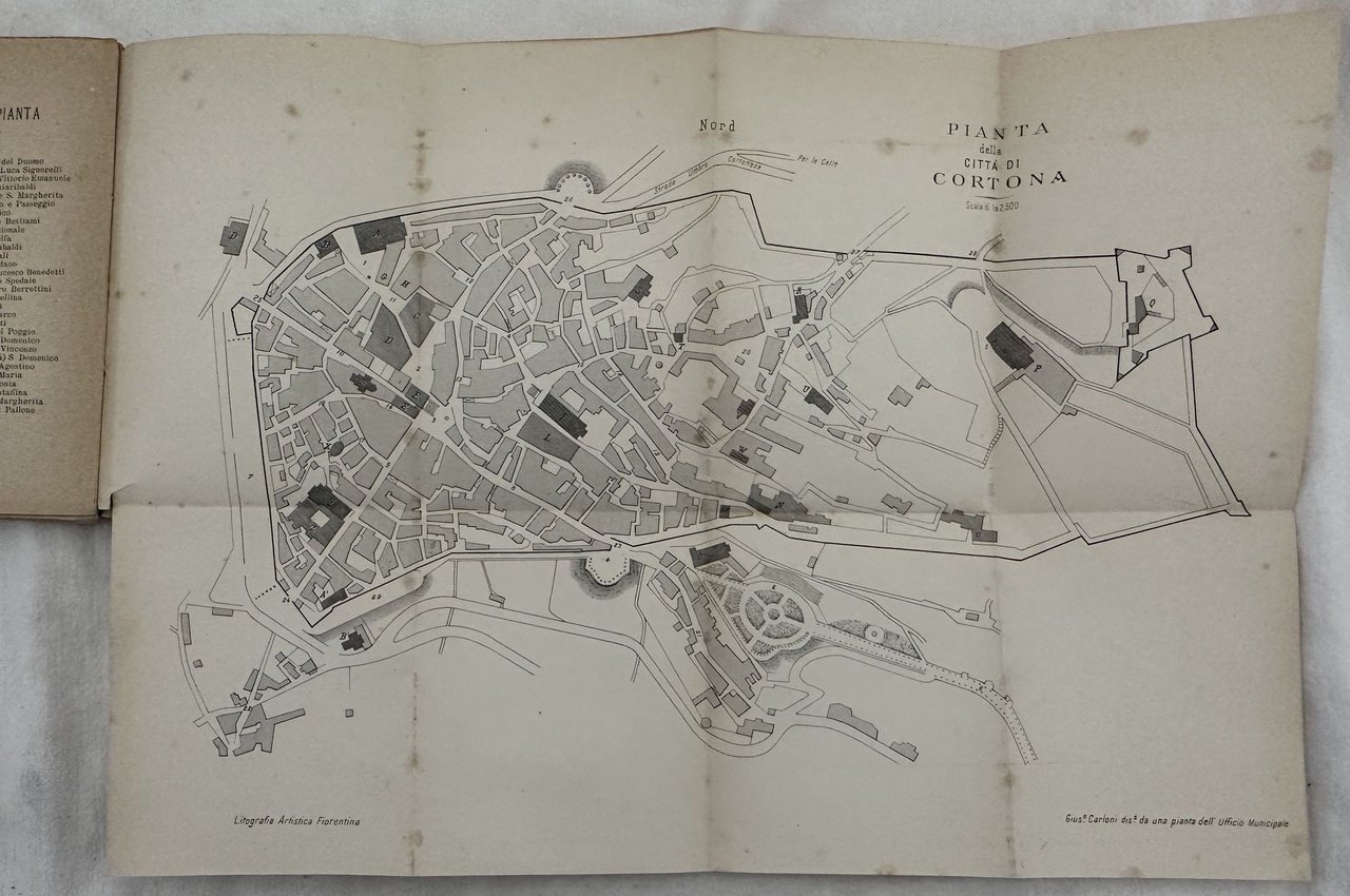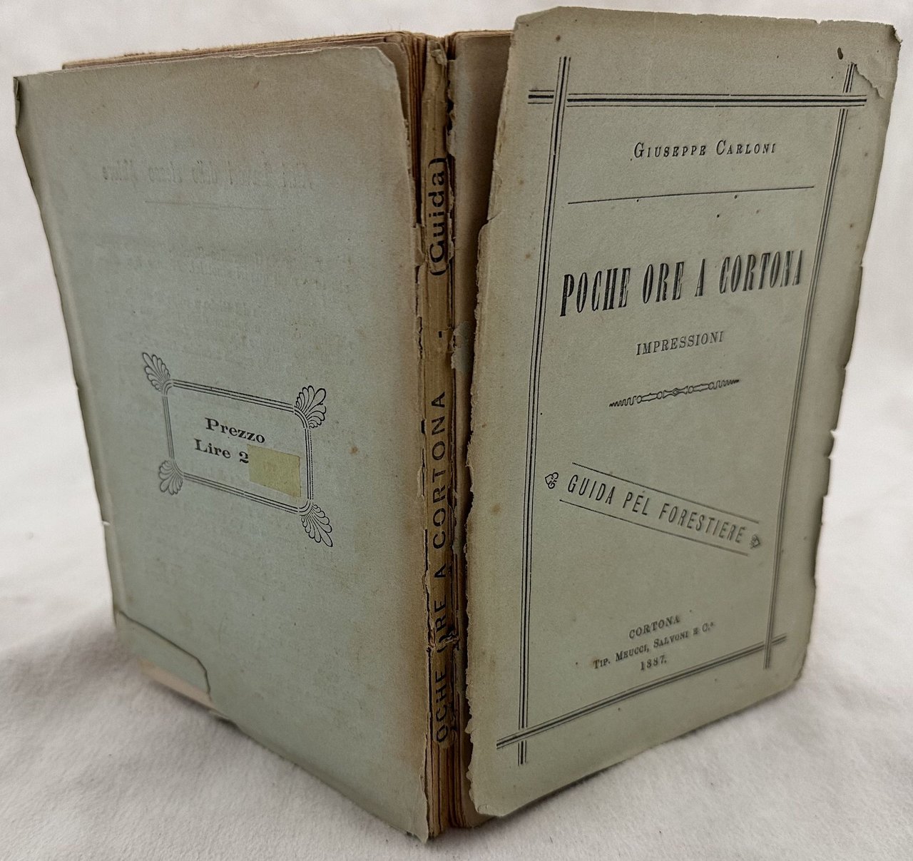 Rara guida del 1887 della città di Cortona scritta da Giuseppe Carloni. La guida è molto dettagliata e descrive oltre alla storia della città, le zone da visitare, arte e curiosità. In appendice: Vescovi di Cortona, Capitani e Commissari della Repubblica Firoentina in Cortona, Capitani o Commissari del Governo Mediceo in Cortona, Lucumoni della R. Accademia Etrusca, I più illustri cortonesi. Veduta di Cortona in antiporta e mappa ripiegata della città in fine. Pubblicità di attività del tempo intervallate tra le pagine. In buone condizioni. Copertina editoriale in discrete condizioni generali con usure ai margini e dorso. Piatto anteriore staccato. Legatura in discrete condizioni con rotture. All'interno le pagine si presentano in buone condizioni con fioriture. In 8. cm 19x13. Pp. 131+(1)+1 tav.Scarce guide of 1887 to the city of Cortona written by Giuseppe Carloni. the guide is very detailed and describes the history of the city, the areas to be visited, art and curiosities. In appendix: Byshops of Cortona, Captains of Repubblica Firoentina in Cortona, Capitani o Commissari del Governo Mediceo in Cortona, Lucumoni della R. Accademia Etrusca, The most faous people in Cortona. View of Cortona in the frontspice and folded map in the end. Advertisings of activities of that time between the pages of the guide. In good conditions. Editorial cover in fair general conditions lightly worn in the extremities. Front plate is detached. Binding in fair conditions with cracks. Inside pages are in good conditions with foxing.In 8. cm 19x13. Pp. 131+(1)+1 tav.