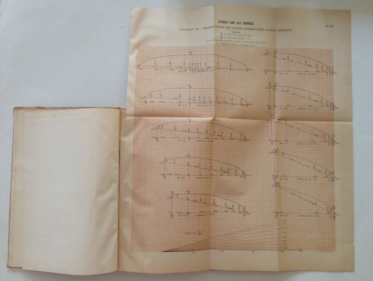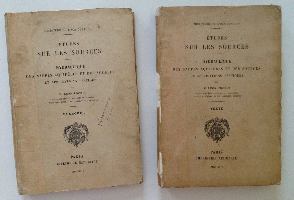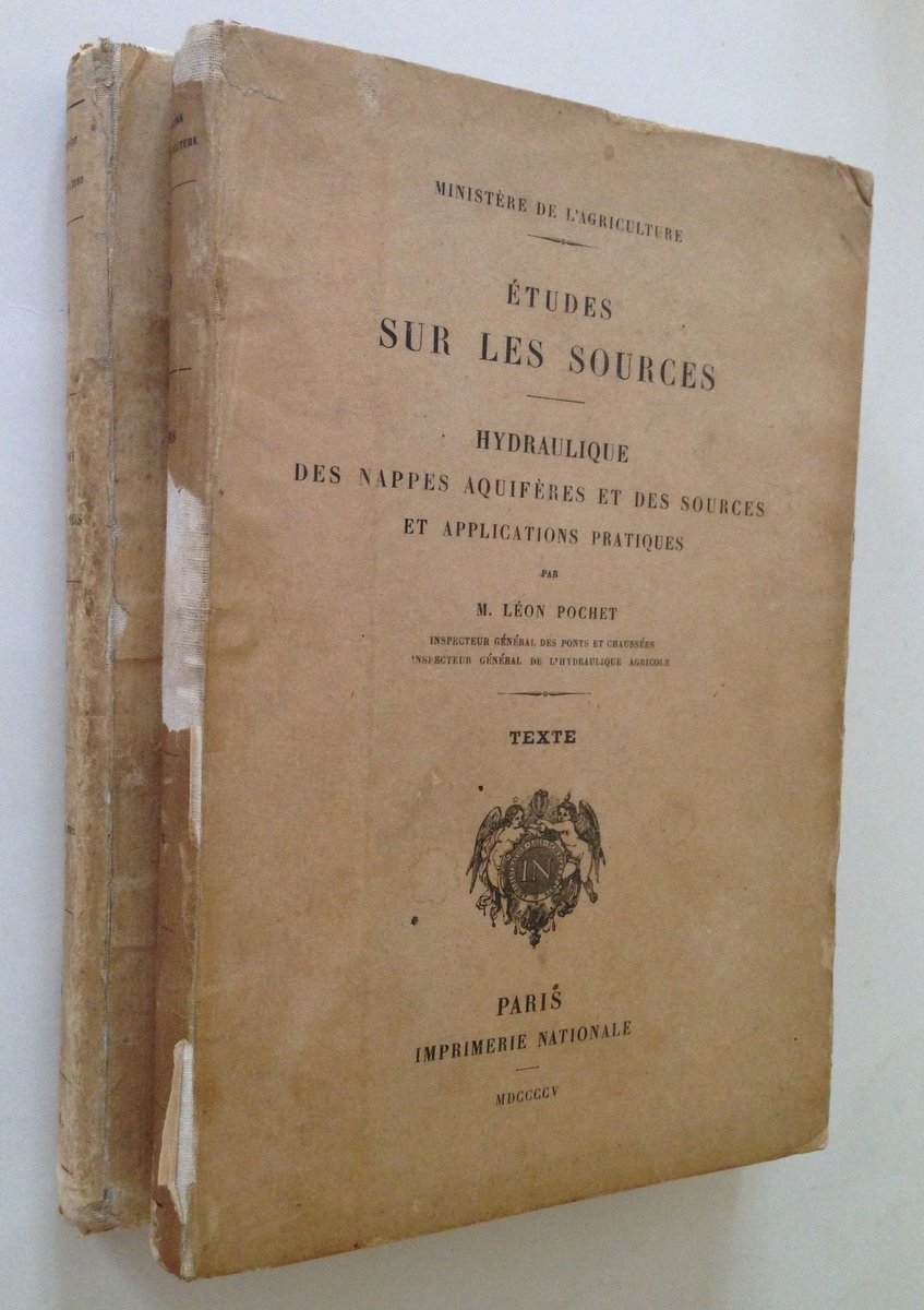 M. LEON POCHET, ETUDES SUR LES SOURCES HYDRAULIQUE DES NAPPES AQUIFERES ET DES SOURCES ET APPLICATIONS PRATIQUES - 2 VOLUMI - PARIS, IMPRIMERIE NATIONALE, MDCCCCV, 2 voll., testo e tavole in 8 gr., pp. 527 e 81 tavv. rip. + volte, cartonato rigido ed. Condizioni di conservazione Esemplari in buono stato con tracce d'uso; alcuni strappetti e pieghette ai margini e agli angoli, qualche macchia ai piatti; dorso con alcune mancanze in particolare al volume del testo; il volume delle tavole in carta patinata presenta una minima gora al contropiatto che si propaga leggermente ad alcune tavole, timbro ex proprietario al piatto anteriore; il volume del testo con timbro ex proprietario al frontespizio; interni buoni. MM855.D3-366