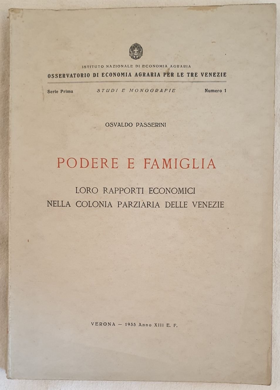 Interessante monografia sul podere e la famiglia e i loro rapporti economici nella colonia parziaria delle Venezie scritta da Osvaldo Passerini edito dall'Osservatorio di economia agraria per le Tre Venezie. All'interno: Cenni sulla colonia parziaria nelle Venezie, Caratteristiche dell'indagine, Le aziende a prevalente carattere zootecnico, cerearicolo, colture arboree prevalenti, I capitoli prodotti e redditi, rapporti fra podere e famiglia colonica, L'annata agraria 1933 e le sue ripercussioni economiche nell'azienda, elementi analitici relativi ai consumi di cinque famiglie coloniche ecc. Dedica autografa dell'autore datata 1937 alla prima carta bianca. In ottime condizioni. Copertina editoriale in buone condizioni generali con lievi usure ai margini e dorso. Legatura in buone condizioni. All'interno le pagine si presentano in ottime condizioni con rare fioriture, ancora da tagliare. In 8. Dim. 26,5x19 cm. Pp. 381. Interesting monography about the farm and its families and their economical relationships in the colony of Venices written by Osvaldo Passerini edited by Osservatorio di economia agraria per le Tre Venezie. Autographed dedication of the author dated 1937 in the blank page. In very good conditions. Editorial cover in good general conditions slightly worn in the edges and spine. Binding in good conditions. Pages in very good conditions with occasional foxings, still uncut. In 8. Dim. 21,5x16 cm. Pp. 381.