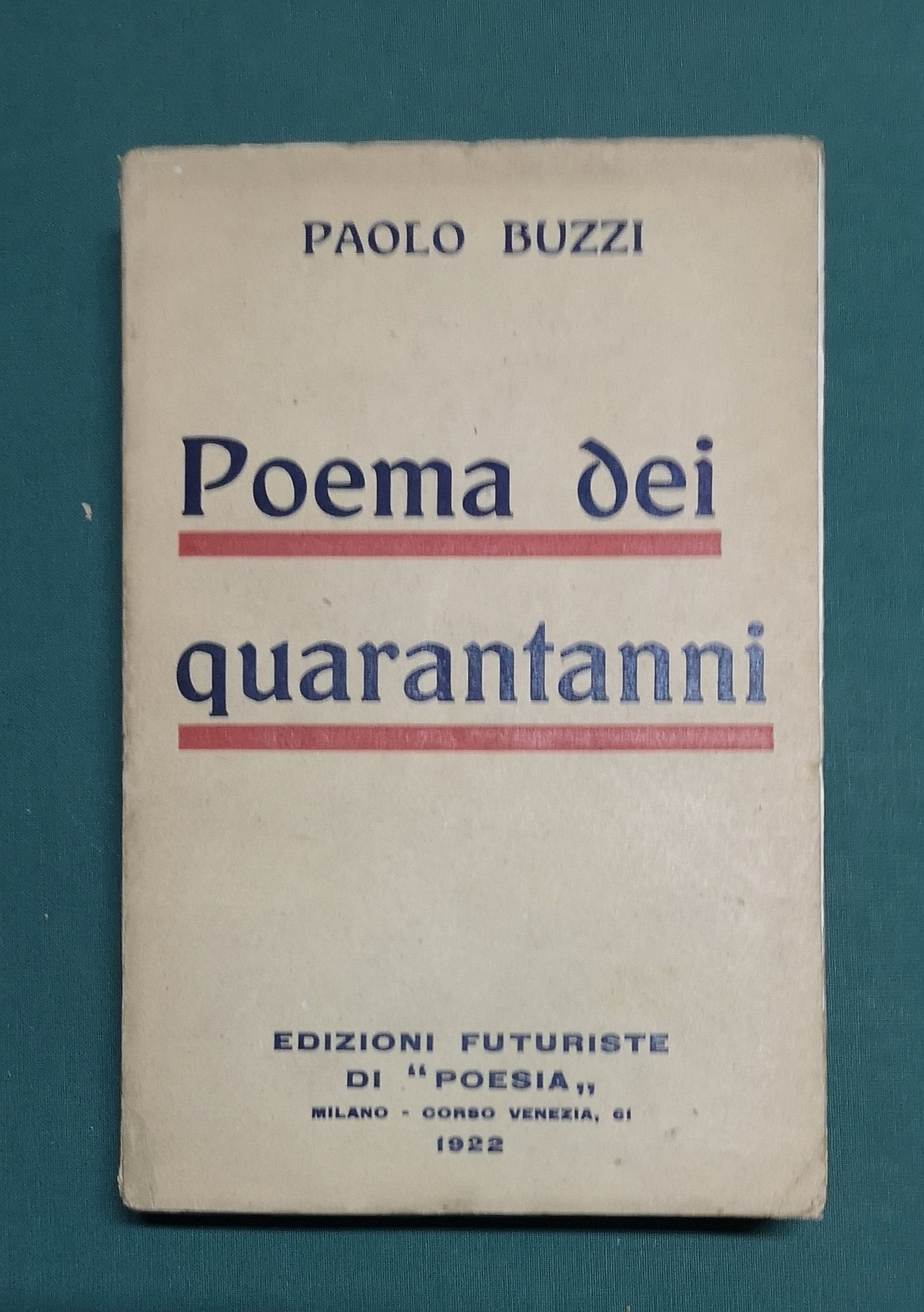 >in-16, pp. 354 (2), 1 ritratto fotografico b.n. dell'autore f.t.; broch. edit. Edizione originale. Poema autobiografico dedicato dall'autore a tutti i fratelli delle avanguardie del mondo: «... E lo dedico ai miei fratelli di tutte le avanguardie del Mondo i quali hanno mostrato tanto spesso d'amarmi....» (pag. 8). SALARIS PAG. 26; SPADUCCI p. 67; Cammarota, Futurismo, 68.18