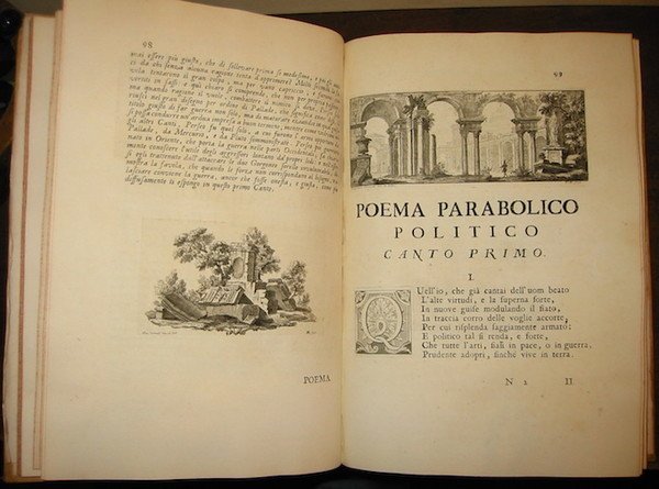 Folio (cm. 35,7), 5 cc.nn. (compresa antiporta f.t. con ritratto del Doge di Venezia, 295 pp. con grandi testate per ciascun canto incise da Pietro Monaco su disegno di Giuseppe Contenti. Iniziali figurate e bei finalini sempre ad opera di Giuseppe Contenti. Frontespizio stampato in rosso e nero. Legatura coeva in piena pergamena con nervi e titolo oro su tassello in pelle al ds. (una piccola macchia e lievi tracce di polvere sul piatto anteriore). Tagli colorati a spruzzo. Carta di guardia libera anteriore parzialmente staccata. Esemplare in ottimo stato di conservazione, stampato su carta grave. Prima edizione e prima tiratura delle figure di uno dei più rari illustrati veneziani del Settecento. Il ritratto in antiporta, inciso da Florenzia Marcello, raffigura il Principe Pietro Grimani, Doge di Venezia e dedicatario dell’opera. Le belle vignette rappresentano forse il primo esempio di libro veneziano illustrato con vedute di antichità romane che, curiosamente, sembrano preannunciare le successive incisioni del Piranesi. Morazzoni, p. 189.