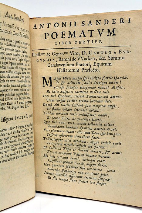 4 feuillets. Pages 403-666. (19,5x15 Cm). Parchemin. Plats richement ornés d'un décor "à l'éventail". Tranches dorées. Traces de liens. Dos refait. Coins et coiffes émoussés. Plats déformés. Poésies de l'historien et littérateur belge, Antoine Sanderus. Elles ont été publiées dans le volume intitulé "Opuscula Minora" dont elles constituent la dernière partie, avec un titre particulier et sont reliées ici à part. Intéressant spécimen de reliure de l'époque en parchemin, avec les plats richement ornés d'un décor "à l'éventail". Papier un peu bruni. Plats déformés.