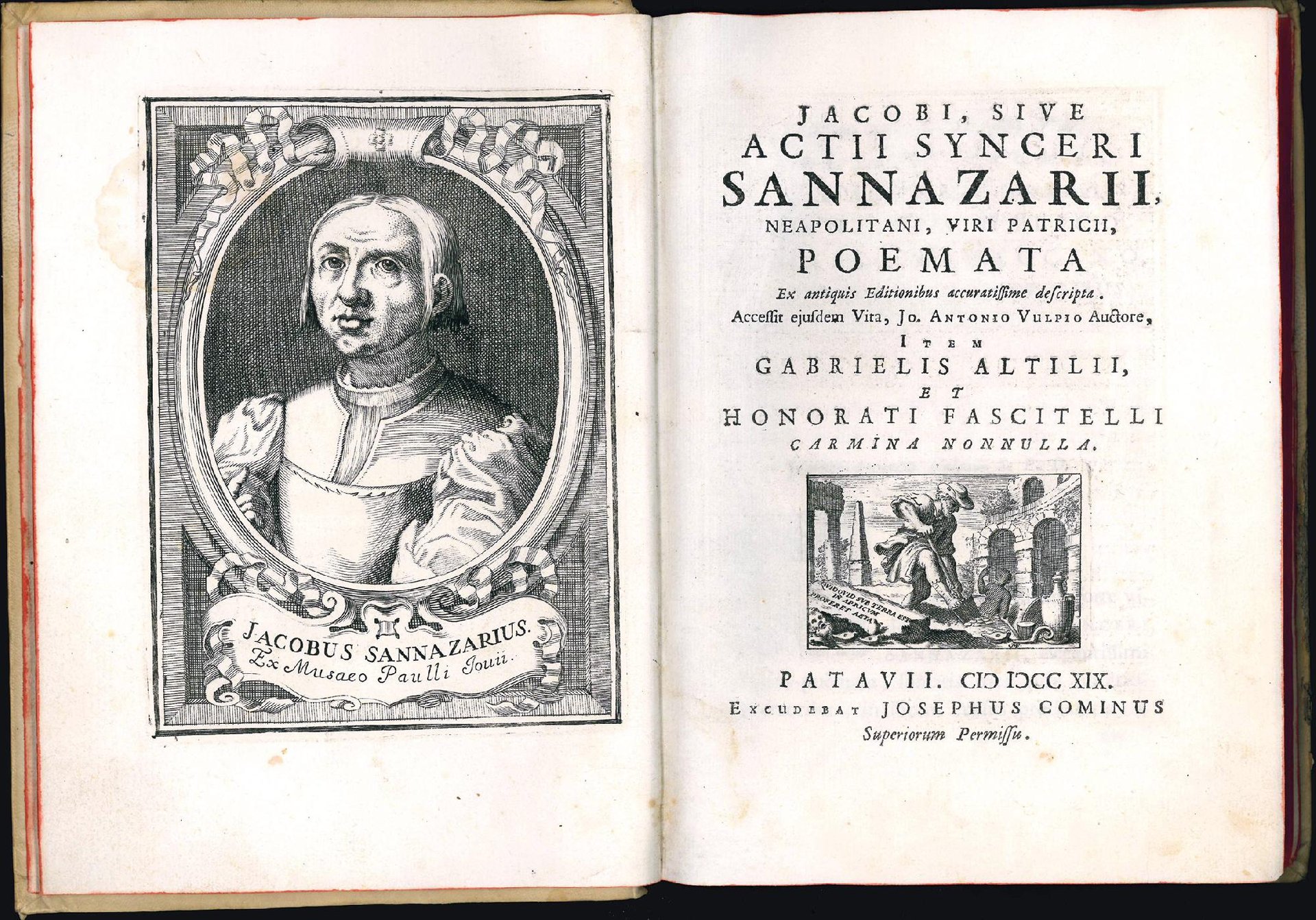 Elegante edizione cominiana delle opere latine del Sannazzaro, tra cui il celebre De partu Virginis, che contiene anche una vita del Sannazzaro di Giovanni Antonio Volpi (1686-1766), i Carmina elegantissima di Onorato Fascitelli (1502-1564) e l'Epithalamium in Nuptias Galeatii Sfortiae et Isabellae Aragoniae di Gabriele Attilio (1440?-1501).