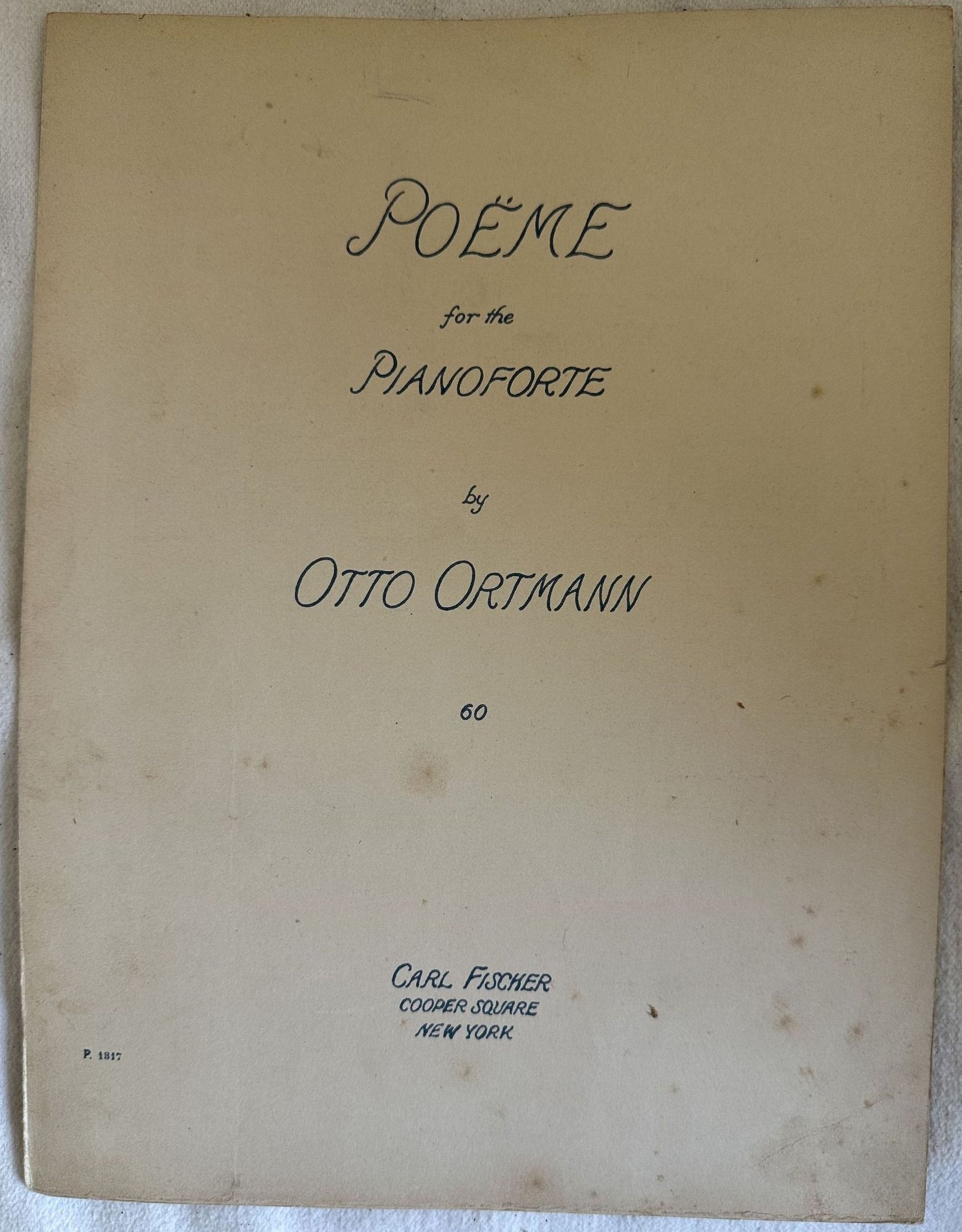 Edizione del 1923 della melodia per pianoforte "Poeme for the pianoforte" del compositore americano Otto Ortmann (1889-1979). In ottime condizioni. Copertina editoriale in ottime condizioni con lievi usure marginali. Legatura in buone condizioni. Pagine in buone condizioni con rare fioriture. In 4. cm. 30,5x23. Pp. 7.Edition of 1917 of the melody for piano of the opera "Poeme for the pianoforte" by the american composer Otto Ortmann (1889-1979). In very good conditions. Editorial cover in good conditions lightly worn in the extremities. Binding in good conditions. Pages in good conditions with occasional foxing. In 4. cm. 30,5x23. Pp. 7.