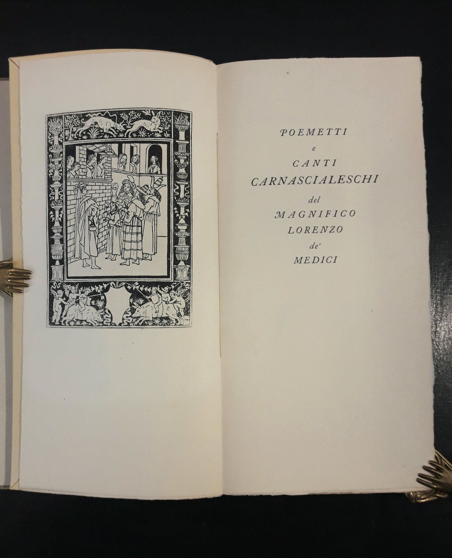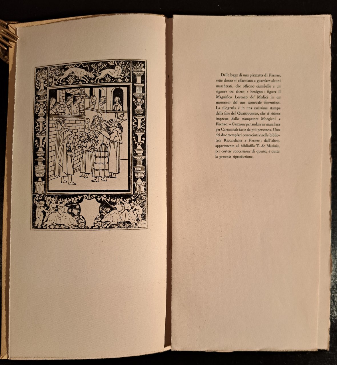 In 8° oblungo, p. 156(18), 5 bianche. Testo a cura di A. Simioni ("Scritori d'Italia", Laterza). Appendice di Giulio Caprin. Fuori testo, doppia pagina ripiegata che riproduce una xilografia del XV secolo. Tiratura di 370 esemplari. Custodia e cofanetto. (Pellizzari, XXXVIII).