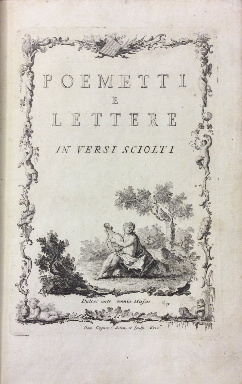 In-8 p. (mm. 220x138), p. pergamena coeva, sottile cornice dorata ai piatti, tit. ms. al dorso (restaurato per picc. manc.), pp. (4),164, compreso il frontespizio figur. e un bellissimo ritratto del conte di Firmian - cui è dedicata l'opera - inc. in rame da D. Cagnoni. Il volume è ornato da 1 grande iniziale figur., 11 finali e 5 pregevoli testate (il tutto finemente inc. in rame dal Cagnoni), così suddivise: 1 (alla dedica) con lo stemma del Conte e 4 ad illustrare i poemetti La Toletta - L'Amore - Il Commercio - Il Gusto. Seguono le lettere a Voltaire, al Cte D. Duranti, al Cte L. Savioli, a Cesare Beccaria, Giovanni Lami, al Cte C. Roncalli, a Luigi Arici. "Prima edizione".Giuseppe Colpani (1739-1822), verseggiatore, fu autore di poemetti didascalici di vario argomento tra cui la "Toeletta" e l'"Emilia", dove insegna sul serio a Nice quel che il Parini ironicamente aveva insegnato al suo giovin signore, così Diz. Treccani,III, p. 359.Solo qualche lieve fioritura, altriim. esemplare su carta distinta, ben conservato.
