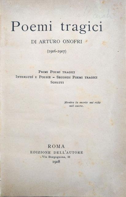 Edizione dell'Autore, Roma, Via Borgognana 38, 15 gennaio 1908 (in fine volume si trova la data completa mentre al verso del front. si riporta: Roma, Stabilimento tipografico della Società Editrice Laziale). In 8vo, pp. 154 (con Indice), leg. post. amatoriale (non conservata la brossura originale). I "Poemi tragici" sono suddivisi in quattro sezioni: "Primi poemi tragici" - "Interludî e poesie" - "Secondi poemi tragici" - Sonetti " - più un "Commiato" non annunciato sul frontespizio. Rarissima opera seconda dell'Onofri, in edizione auto - edita a spese dell'Autore. Arturo Onofri (Roma, 15 settembre 1885 – Roma, 25 dicembre 1928) è stato un poeta e scrittore italiano, tra i massimi esponenti della poesia metafisica in Italia. Nacque da una agiata famiglia borghese, il padre romano e la madre polacca (il padre nel 1897 entrò nei ruoli direttivi della Cassa di Risparmio). Il giovane si iscrisse al liceo classico di Tivoli nel 1901 e ricevette una educazione privilegiata e culturalmente varia, aperta al nuovo: ad esempio, il suo gusto musicale fu subito indirizzato verso il sinfonismo europeo e le liturgie di Wagner, a scapito del più tradizionale melodramma italiano, culminante in Puccini. Le cartoline e le lettere di questo periodo, indirizzate ai genitori e rimaste inedite, testimoniano la nostalgia di casa e comprendono richieste di libri scolastici, abiti e altro materiale necessario alla sua permanenza fuori casa. Onofri iniziò a dedicarsi all'attività letteraria molto presto, fin da giovanissimo. Mai stretto da particolari necessità di ordine economico, poté consacrarvisi liberamente e affacciarsi al nuovo secolo con spirito elegante e ironico. Fu così che si avvicinò al cenacolo crepuscolare, prendendo a frequentare i più noti ritrovi letterari romani dell’epoca, fra cui l’Aragno e il Caffè Greco. Nel 1916 sposò Bice Sinibaldi, da cui ebbe due figli. Fu perciò spinto a cercarsi una sistemazione, ma "refrattario a impegni gravosi e alle vere responsabilità" preferì assecondare la propria indole, impiegandosi nella Croce Rossa. Secondo i riferimenti, risulta che Onofri pubblicò le sue prime quattro raccolte di versi sulla rivista "Vita letteraria" ("Liriche", 1907; "Poemi tragici", 1908; "Canti delle Oasi", 1909; "Disamore", 1912). In tutte queste opere si riportano le relative tipografie di stampa ma non compare riferimento alcuno alla editorialità della rivista, sebbene tutte le raccolte risultino "ufficilamente" apparse nello stesso anno delle edizioni auto – edite e sempre, peraltro, a spese dell'Autore. Ragion per cui resta incerto se esse siano uscite dapprima in una sorta di "ante litteram" auto -editoriale, che avrebbe poi goduto della comparsa del nome della rivista. Nello specifico: "Liriche", marzo 1907, all’insegna della "Vita Letteraria" ma per i tipi della Tipografia della Biblioteca di Cultura Liberale di Firenze (riedite poi nella collana "Opera prima", Garzanti, 1948), la prima silloge poetica, trentuno componimenti scritti fra il 1903 e il 1906; "Poemi tragici", gennaio 1908, all’insegna della "Vita Letteraria" ma usciti a spese dell'Autore, Roma, Via Borgognana 38, Roma, Stabilimento tipografico della Società Editrice Laziale, trentotto componimenti scritti fra il 1906 e il 1907; "Canti delle Oasi", 1909, ancora edizione dell‘Autore, Roma, Via Borgognona 38, tipografia Tuscolana di Frascati; "Disamore", 1912. Queste raccolte verranno poi raggruppate con il titolo di "Liriche" (Ricciardi, Napoli, 1914, tipografia Angelo Trani, novembre 1913) ed “eccetto limitatissime novità" consisteranno in una ristretta scelta della produzione precedente, arricchita di varianti e di correzioni minime. Tutte le opere di Onofri sono da considerarsi molto rare a reperirsi. Esemplare con un usuale ingiallimento del tempo, in buono stato di conservazione.