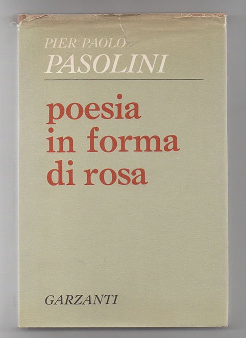 LIBROPrima edizione. Sovracoperta lievemente scolorita, per il resto un ottimo esemplare.Raccolta di versi: «Gli anni Sessanta furono per Pasolini gli anni dello smarrimento e dell’incertezza: venutagli meno la fiducia nella griglia interpretativa marxiana, il mondo cominciò ad apparirgli come un gigantesco caos in cui la borghesia (intesa più come malattia che come classe sociale) occupava l’intero orizzonte e delineava un’oscura “nuova preistoria”. […] Dal punto di vista letterario, la necessità di confrontarsi con il magma prende l’aspetto della sparizione della griglia metrica in poesia; dopo il tour de force rabbioso di “La religione del mio tempo” (1961), in “Poesia in forma di rosa” (1964) cerca l’informale, o i calligrammi, o un montaggio nevrotico da nouvelle vague […]» (Siti, voce del DBI, 2014).