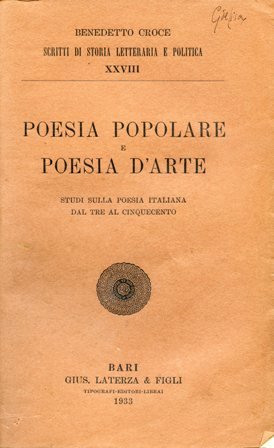 In-8°, pp. XII, 524, bella legatura m. pergamena e angoli con titolo in oro entro doppio tassello in pelle al dorso e piatti marmorizzati. Brossure originali conservate. Qualche lieve sottolineatura a matita. Perfetto stato. Prima edizione. Nell'indagine crociana si distinguono e insieme e si affiancano una poesia che 'ritrae sentimenti semplici in corrispondenti semplici forme' e una poesia che 'muove e sommuove in noi grandi masse di ricordi, di esperienze, di pensieri, di molteplici sentimenti e gradazioni e sfumatura di sentimenti'. Fra i contributi raccolti: La poesia del Petrarca; Il Boccaccio e Franco Sacchetti; Fazio degli Uberti ed altri lirici del Trecento; Rime autobiografiche gnomiche politiche e poesia popolare; Letteratura di devozione; Epicità popolare; Il secolo poesia; La commedia del Rinascimento, etc. Borsari, 2369. Cione, 199.