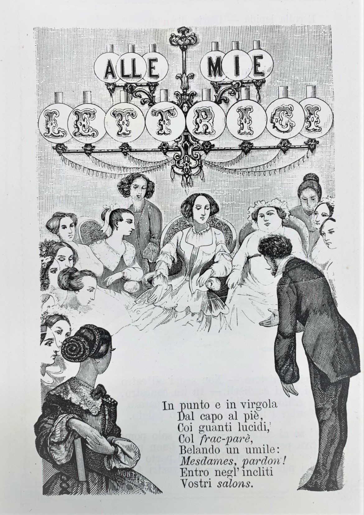 >3 vol. in 1 tomo in-8 (230x163), pp. 346; 224; 278; legatura in mezza tela, titolo e filetti in oro su tassello in pelle al dorso, piatti marmorizzati, tagli spriuzzati. Frontespizi figurati e numerose incisioni in legno anche a piena pagina di O. Monti, testo entro graziosa cornice tipografica. La raccolta illustra con le sue poesie uno spaccato della società ottocentesca (Il laureando, la ricetta del medico condotto, il buon operaio, il cattivo operaio, Carlo Alberto, Maria Luigia e Francesco I, Al don Pirlone del Pungolo etc. Arnaldo Fusinato (Schio, Vicenza, 1817 - Roma 1889) fu poeta e patriota italiano. Volontario nel 1848, partecipò l'anno dopo alla difesa di Venezia, per la cui resa scrisse l'ode A Venezia . Fu autore di satire di costume, novelle sentimentali in versi, canti patriottici ecc. (Poesie, 1853; Poesie complete, 1880-81) Ottimo esemplare ben conservato e marginoso.