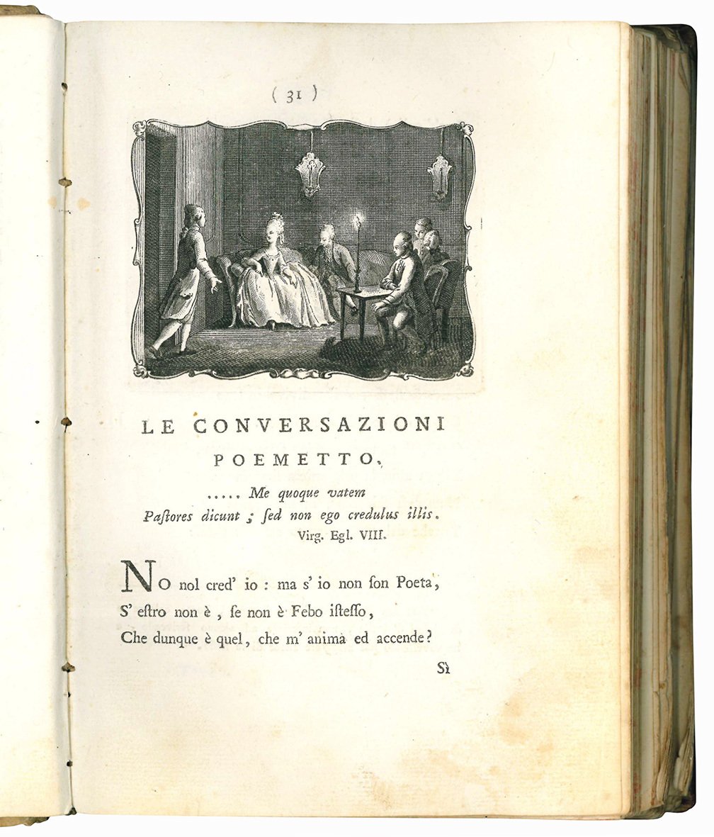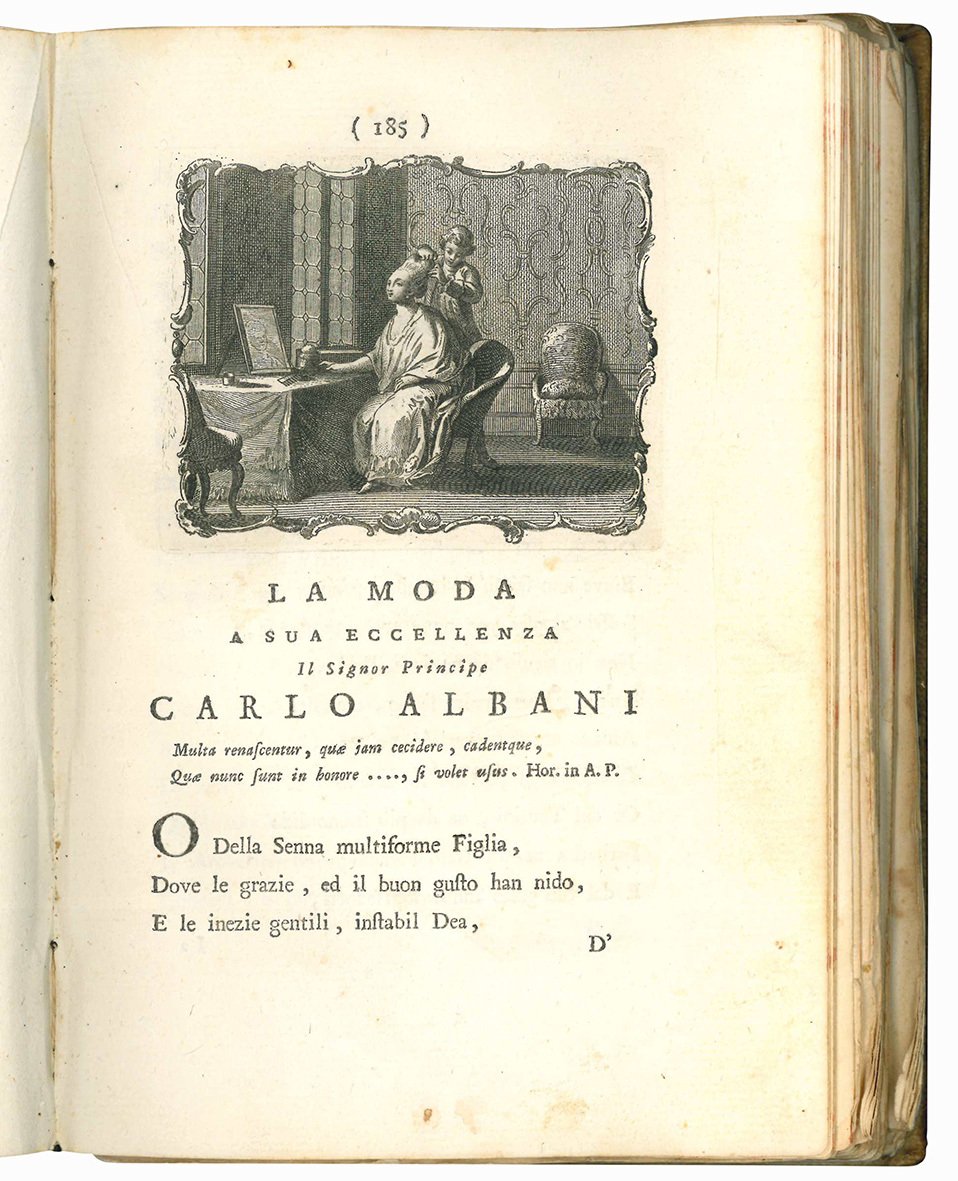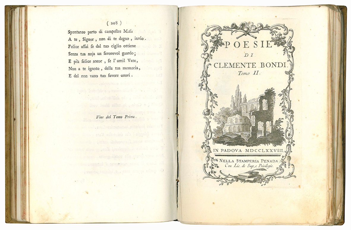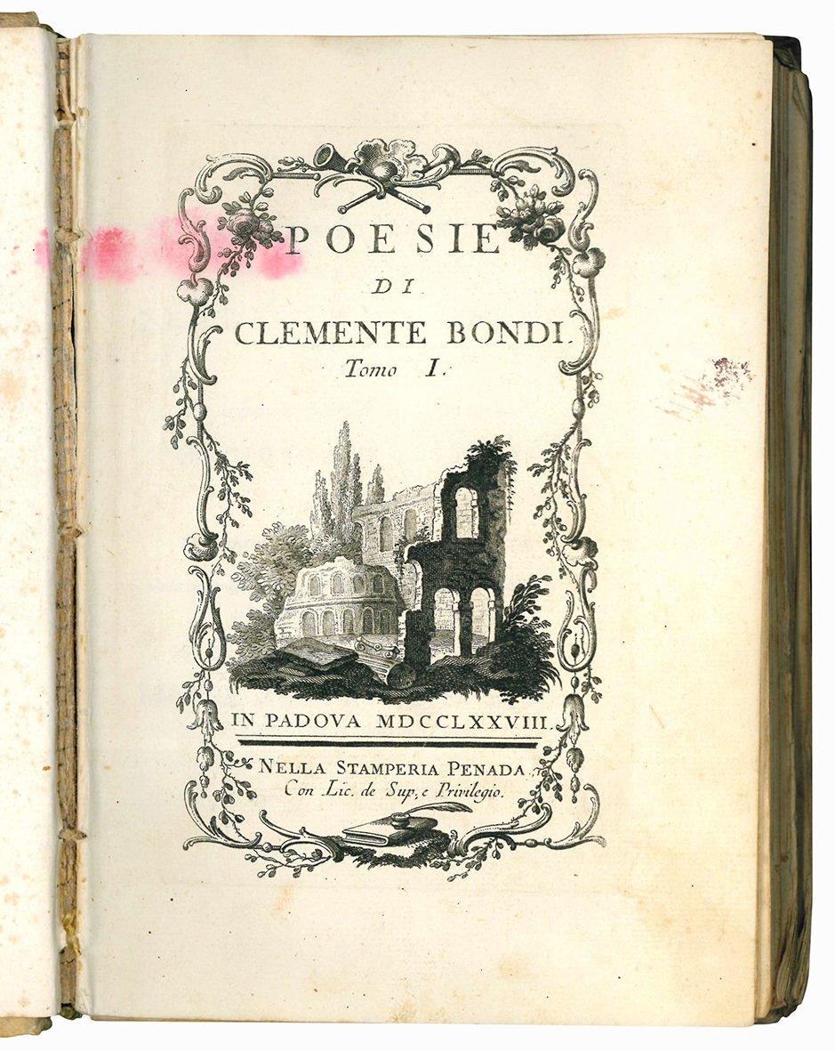 Edizione originale di questa raccolta poetica dello scrittore arcade Clemente Bondi (Mezzano Superiore, 1742 - Vienna, 1821), il cui pseudonimo era Metabo Prianeo. Religioso gesuita, poeta e traduttore, fu con Giambattista Bodoni uno degli uomini di lettere che collaborarono alla stamperia ducale di Parma. La raccolta comprende poemetti in endecasillabi, sonetti, epistole, anacreontiche, qualche canzone in settenari. Si segnalano in particolare i due poemetti Le conversazioni e La moda.