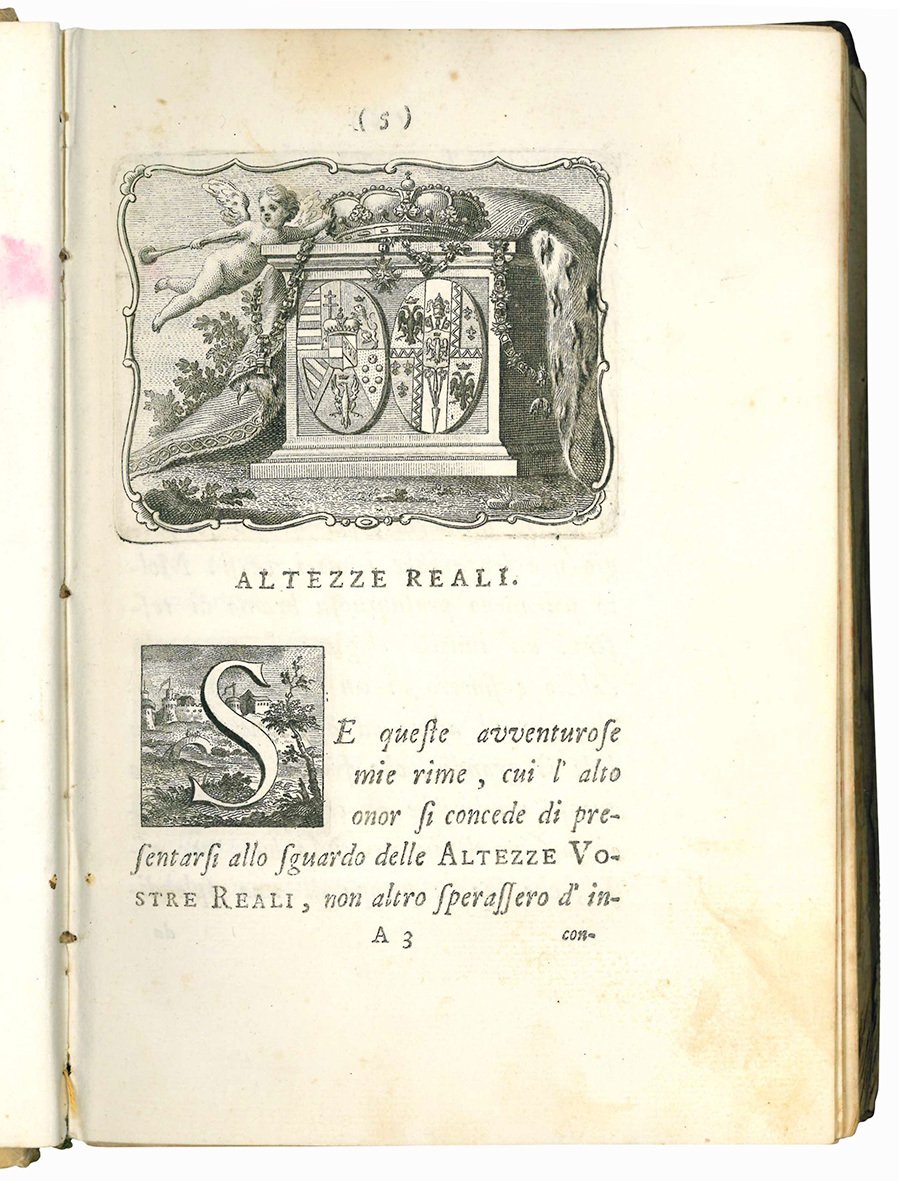 Due tomi rilegati insieme in un volume in 8vo (mm 194x133); pp. 208; 221, [1]. Segnatura: A-N8; A-O8. Il secondo tomo è presente nella variante B, che non prevede il fascicolo P. Ogni tomo è dotato di proprio frontespizio calcografico con vignetta raffigurante antichi ruderi entro cornice floreale, diciotto testatine incise all'acquaforte, iniziali calcografiche. Dedica dell'A. al principe Ferdinando Carlo d'Austria e alla principessa Maria Beatrice D'Este alle cc. A3-A5 del primo tomo. Lievi aloni al margine di alcune carte. Piena pergamena coeva con titolo in oro sul tassello al dorso. Tagli marmorizzati. Piccole macchie e lievi aloni al dorso e ai piatti, minime mancanze il dorso. Vari fascicoli sciolti.