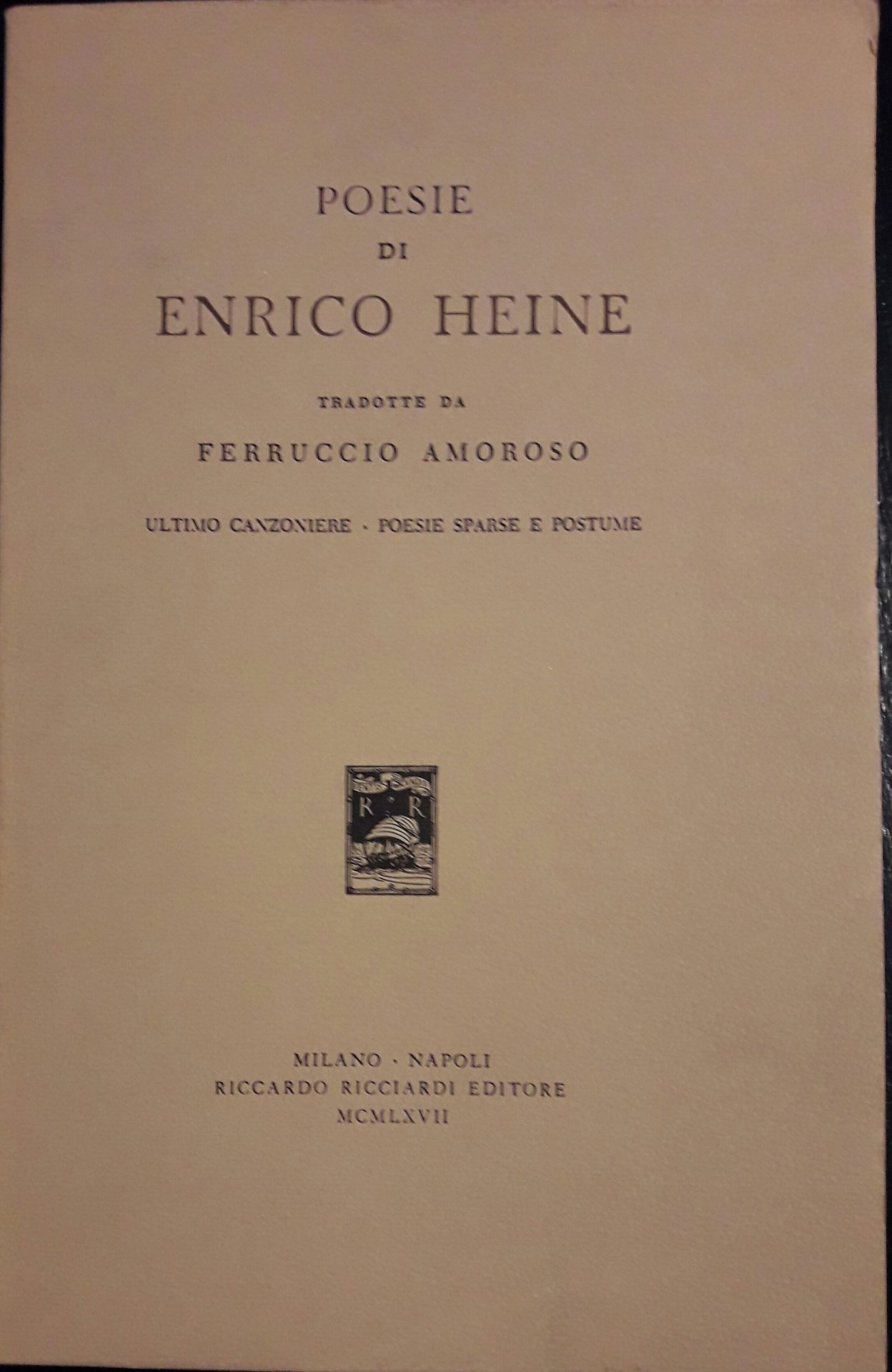In 8°, pp. 268. Terzo volume della raccolta ricciardiana. Raccoglie "Ultimo canzoniere" e "Poesie sparse e postume". Brossura ed. Intonso. Perfetto