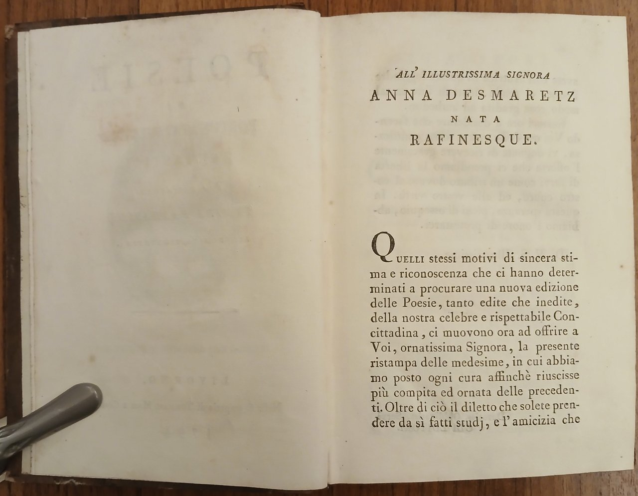 - pp. XI,(1),238,(2), con un ritratto calcografico dell'autrice all'antiporta inciso da Raffaello Morghen tratto dal dipinto del 1792 di Angelica Kauffmann ed una seconda tavola calcografica dell'incisore livornese Pompeo Lapi fuori testo