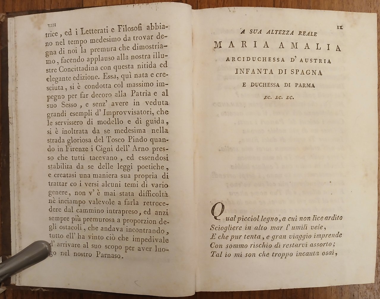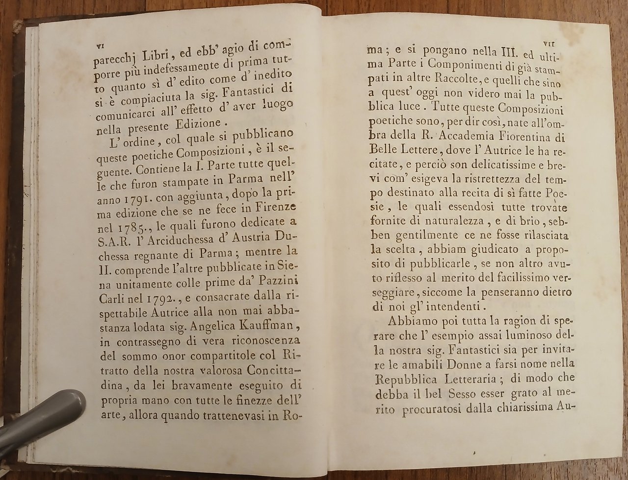 (Sulgher Fantastici Fortunata poetessa estemporanea, Temira Parraside nell'Accademia dell'Arcadia) In 8° antico (cm 17,5 x 12), legatura coeva in mezza pelle, al dorso tassello con titoli ed impressioni in oro, tagli spruzzati, pp. XI,(1),238,(2), con un ritratto calcografico dell'autrice all'antiporta inciso da Raffaello Morghen tratto dal dipinto del 1792 di Angelica Kauffmann ed una seconda tavola calcografica dell'incisore livornese Pompeo Lapi fuori testo. Raccolta di poesie in parte inedite. Ottimo stato di conservazione.