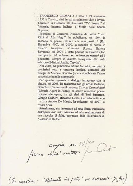 Copia n. 58/100, autografato. In copertina: "Ritratto del Poeta" di Alessandro De Bei. Senza data, probabilmente autoprodotto o comunque un edizione artigianale con uso di fotocopiatrice. Spedizioni tracciabili con raccomandata entro 24 ore dall'ordine. First edition. Soft cover in fine conditions, no inscriptions or markings inside. Worldwide delivery.