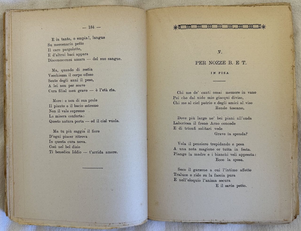 Edizione del 1912 di questa raccolta di poesie del poeta e scrittore Giosuè Carducci (1835-1907). All'interno: Decennali, Levia Gravia, Juvenilia.<BR>Copertina editoriale originale. In buone condizioni. Copertina editoriale in buone condizioni generali con lievi usure marginali. Legatura in discrete condizioni con qualche pagina allentata. Pagine in buone condizioni con fioriture. In 8. cm 19,5x13. Pp. XVI+336.Edition of 1912 of this colleciton of poems by the poet and humanist Giosuè Carducci (1835-1907). Editorial cover. In good conditions. Editorial cover in good conditions lightly worn in the extremities. Binding in fair conditions with some loose pages. Pages in good conditions with foxing. In 8. cm 19,5x13. Pp. XVI+336.