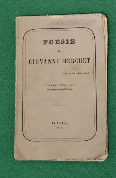 17x10,5 cm; 144 pp. Brossura editoriale con titolo entro cornice al piatto anteriore (minima mancanza al margien superiore bianco). Dorso sciupato e con piccole lacune. All'interno buona copia. Curiosa edizione con l'intestazione "ITALIA" come luogo di stampa. Le poesie di Berchet ebbero grande successo e carratterizzarono il romanticismo italiano.