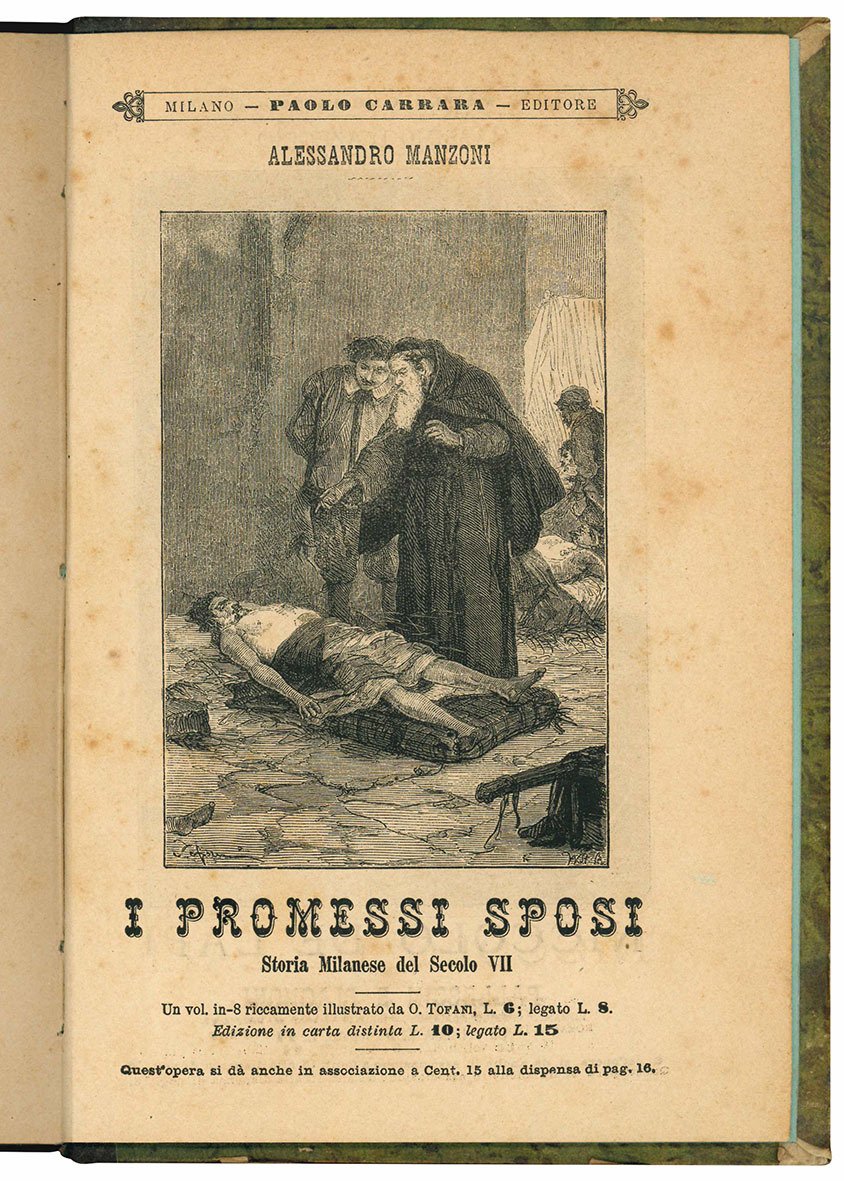 Mm. 233x157. Pp. 813, [3]. Ritratto dell'autore all'antiporta, numerose illustrazioni in bianco e nero, anche a piena pagina, reallizzate da A. Gallieni nel testo. Carta uniformemente brunita, lievi fioriture. Le ultime due carte (non numerate) riportano gli avvisi editoriali de I promessi sposi. Storia milanese del secolo VII di Alessandro Manzoni e di Niccolò de' Lapi ovvero i Palleschi e i Piagnoni di Massimo D'Azeglio. Mezza pelle coeva con dorso a quattro nervetti con impressioni a secco e in oro. Piatti rivestiti con carta marmorizzata, tagli marmorizzati. Mancanze alle cuffie e lungo le cerniere, lievi abrasioni al dorso e ai piatti.