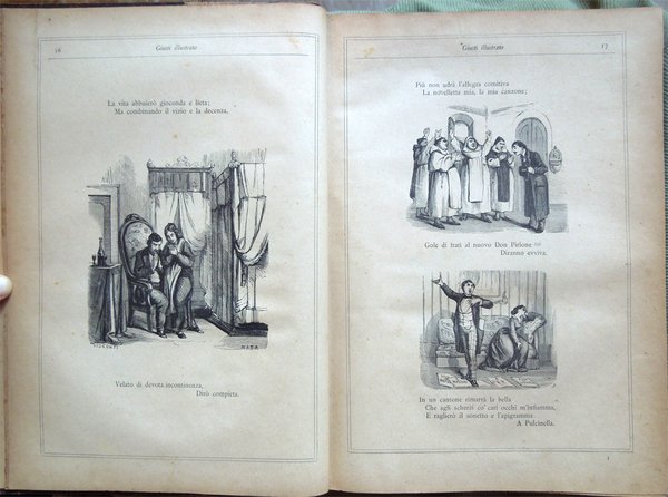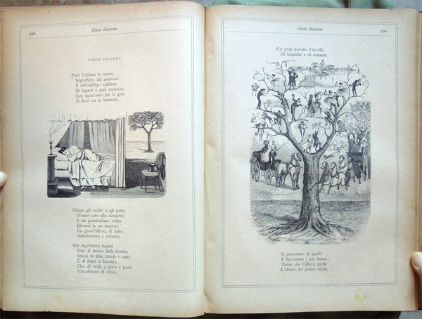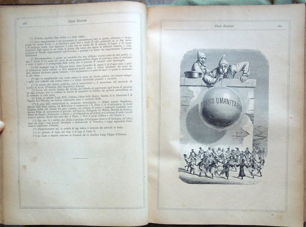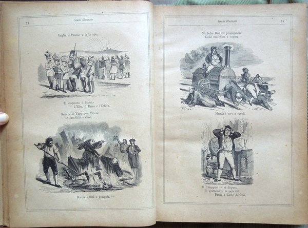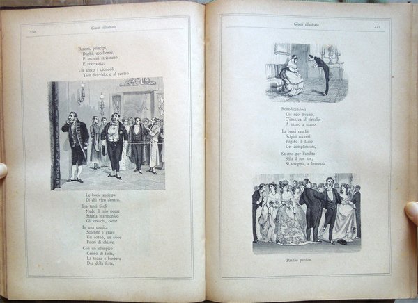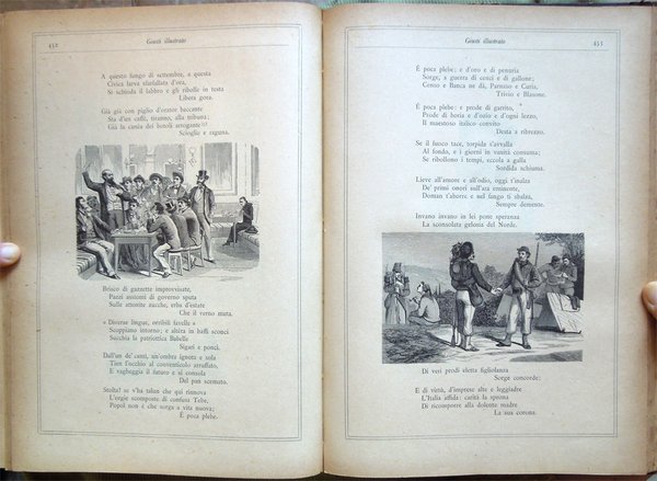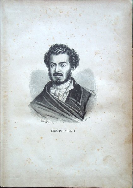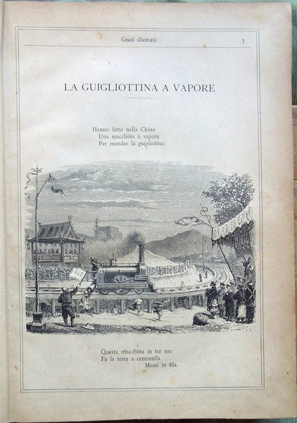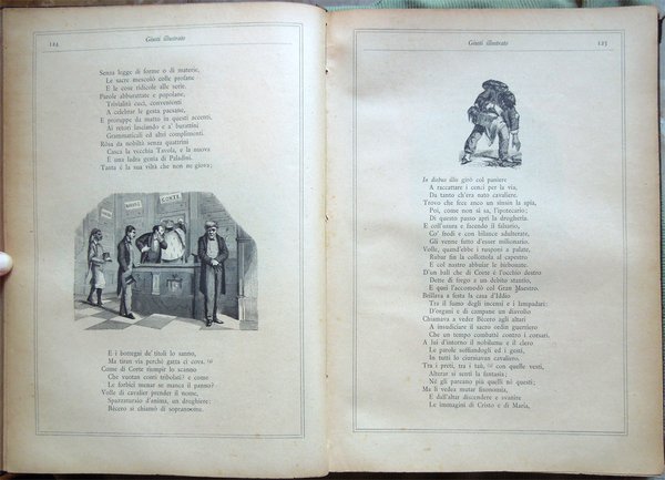 In-4° (32 x 22,5 cm), pp. (8), 559, (1), legatura coeva in mezza tela con titoli in oro al dorso. Segni d'uso e del tempo alla legatura, in particolare, leggera abrasione nella parte superiore del dorso, che ha provocato la parziale caduta dei titoli, e qualche abrasione alla carta nei bordi e nei labbri dei piatti. Con un ritratto del Giusti fuori testo e centinaia di illustrazioni in bianco e nero nel testo, opera di Adolfo Matarelli (Mata). Leggeri, piccoli segni d'umido alle prime e alle ultime carte. Normale patina del tempo alle pagine, con leggere arrossature, in particolare ai margini, dovute al tipo di carta. L'opera, stampata presso la Tipografia degli Operai di Milano, non riporta alcuna data: un'edizione recante lo stesso titolo e lo stesso numero di pagine, con il medesimo apparato iconografico, ma su carta distinta, fu pubblicata dagli editori Aliprandi e Galliani, sempre a Milano, nel 1887; la presente edizione, su carta economica, fu impressa, probabilmente, in quegli anni.