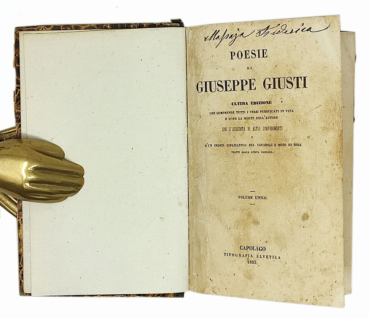 Capolago, tipografia Elvetica. Volume unico. Anno: 1853 (Ultima edizione che comprende tutti i versi pubblicati in vita e dopo la morte dell'autore con l'aggiunta di altri componimenti e d'un indice esplicativo dei vocaboli e modi di dire tratti dalla lingua parlata). Pagine numerate: XXX + 510. Dimensioni: 12,5 x 18,5 cm circa. Stato di conservazione: diffuse macchioline marroni sulle pagine, una firma d'appartenenza a penna sul margine superiore del frontespizio, un piccolo strappo con piccola mancanza sul margine verticale (bordo bianco) del foglio che contiene le due pagine 21 e 22, una riparazione (con una strisciolina in carta) sul pagina 31, da pagina 496 si si passa a pagina 499 (parte dell'indice esplicativo dei vocaboli) ma presumo sia semplicemente un errore di stampa della numerazione delle pagine in quanto c'è una sostanziale continuità alfabetica tra le due pagine (ultima parola di pagina 496: 'Staio', prima parola di pagina 499: 'Strozzino'), un piccolo alone (presumibilmente causato da una pregressa umidità) sul margine inferiore degli ultimi fogli (da pagina 501) ma, nel complesso, un esemplare più che discretamente conservato. Privo di scritte o sottolineature nel testo.