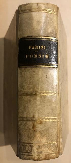 Firenze, Barbera, Bianchi e C., 1858. In 16esimo, antip. con il ritratto del Parini protetto da velina, pp. XXXVIII, 476 (con Indice), contropiatti in carta lucida decorata, leg. orig. in piena pergamena rigida con titolo oro su tassello al dorso, tagli in rosso. Il volumetto divide i versi del Parini in quattro parti: il Giorno, le Poesie Liriche, gli Sciolti e i Sermoni, le Rime piacevoli e satiriche. E alla raccolta si fa precedere la Vita che del Poeta scrisse Camillo Ugoni, “vita che ci parve ricca di affetto e di peregrine notizie” giacché chi la scrisse ebbe a vivere nei luoghi stessi ove il Parini e pertanto poté conoscerne meglio di ogni altro i costumi. Una leggera e contenuta macchia di umido all'angolo in alto a destra delle pagine, buono stato di conservazione. Giuseppe Parini (Bosisio Parini, 23 maggio 1729 - Milano, 15 agosto 1799) nato Giuseppe Parino, è stato un poeta e abate italiano. Membro dell'Accademia dei Trasformati, fu uno dei massimi esponenti dell'Illuminismo e del Neoclassicismo in Italia. .