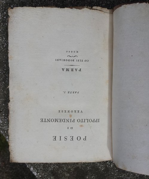 In-16 (16 cm) (2) 94 (2), (4) 142 (4). Cartoncino rustico, titolo manoscritto al dorso. Riferimenti: Brooks, Edizioni bodoniane, n. 782. Legatura semplice con piccole mancanze ma per altro bell'esemplare. In-16 (16 cm) (2) 94 (2), (4) 142 (4). Rustic cardboard, handwritten title on the spine. References: Brooks, Bodonian Editions, n. 782. Simple binding with small lacks but otherwise fine example.