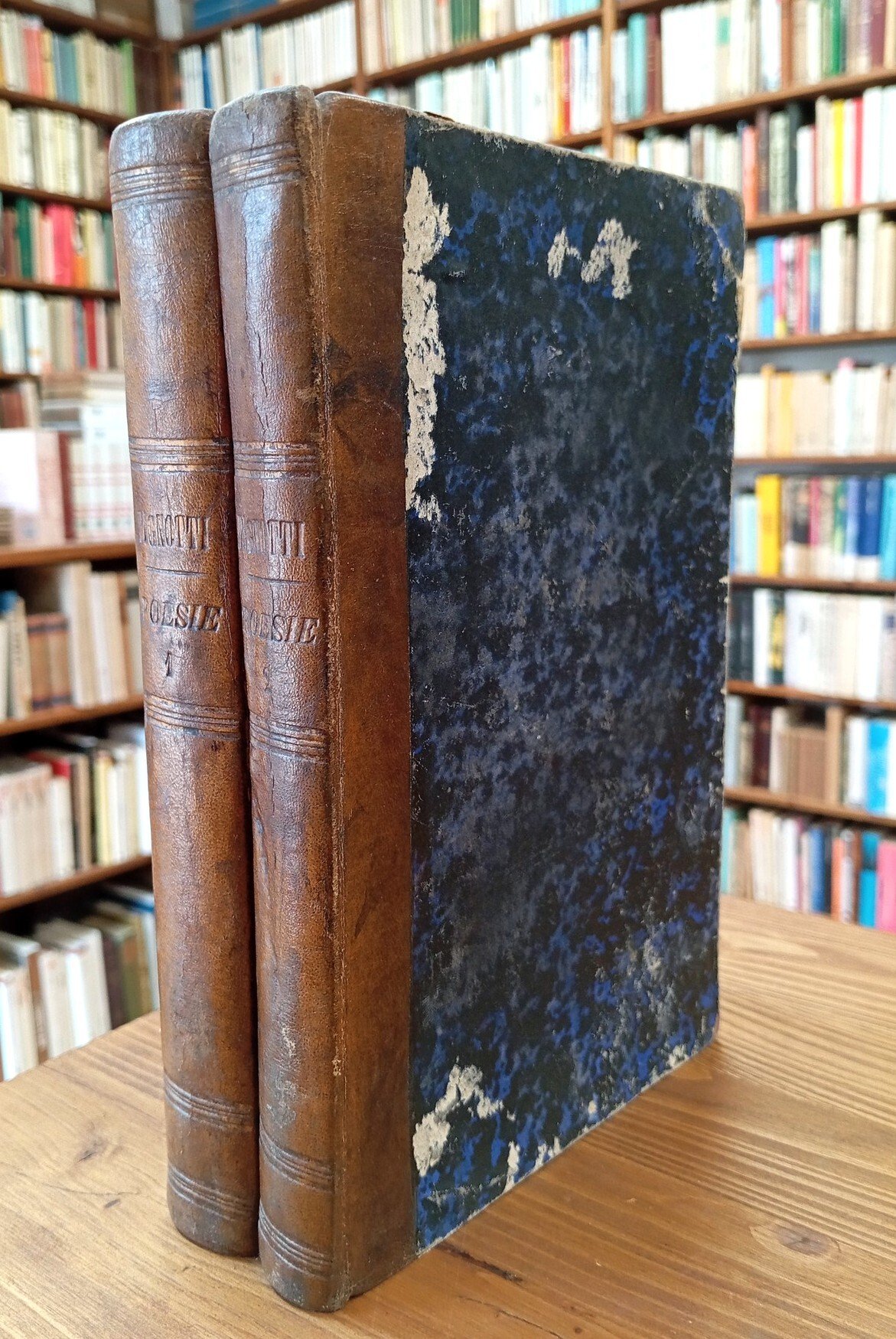 Due volumi rilegati in uniforme mezza pelle con titolo impresso al dorso, 191 + 258 pagine; ritratto dell'autore all'antiporta del primo volume, alcune splendide incisioni su tavole intercalate nel testo. Contiene le seguenti opere in versi: Favole esopiane - Novelle - Poesie di vario metro - Imitazioni di satire di Giovenale e d'Orazio. Piatti un poco consunti, ordinarie fioriture e bruniture alle carte; nel complesso opera integra e ben conservata, godibile in ogni sua parte.