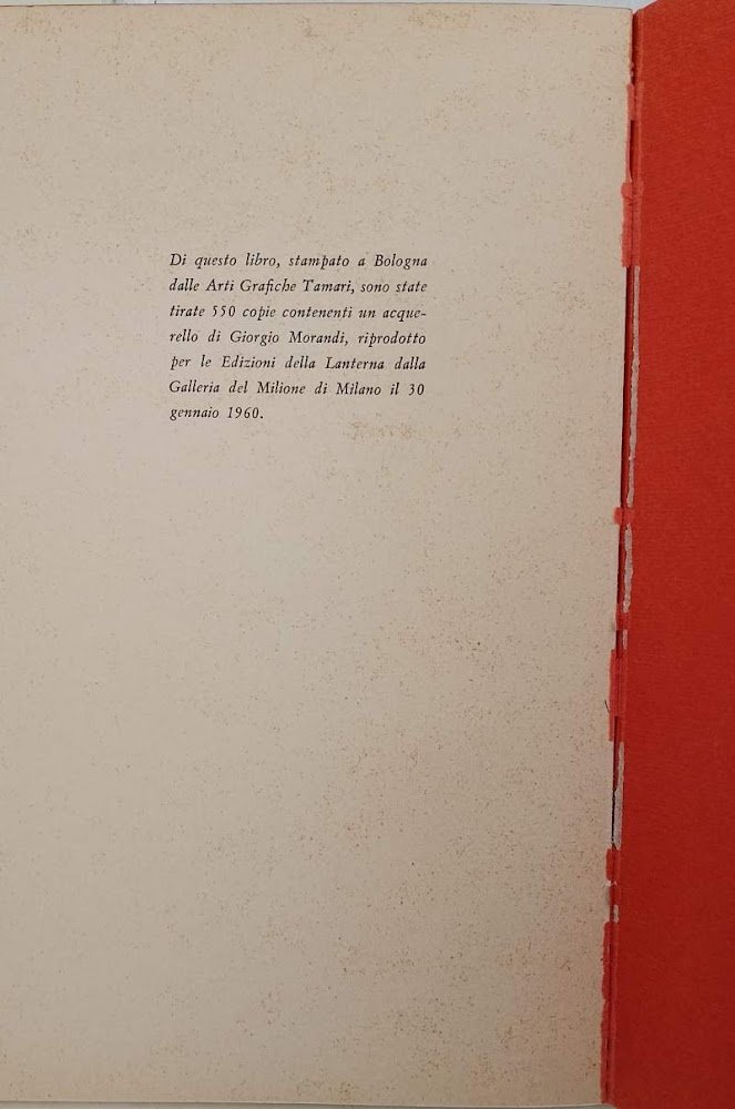 In 8', br. ed., pp. 51, testi in italiano e inglese, con uno studio di Alfredo Rizzardi e un acquerello di Giorgio Morandi; edizione limitata a 550 copie. Scolorimenti alla cop., interno in buono stato, ordinari segni del tempo.(foto) ***Due to bureaucratic reasons, books dated over 70 years old cannot be immediately exported, please contact us before placing the order.***