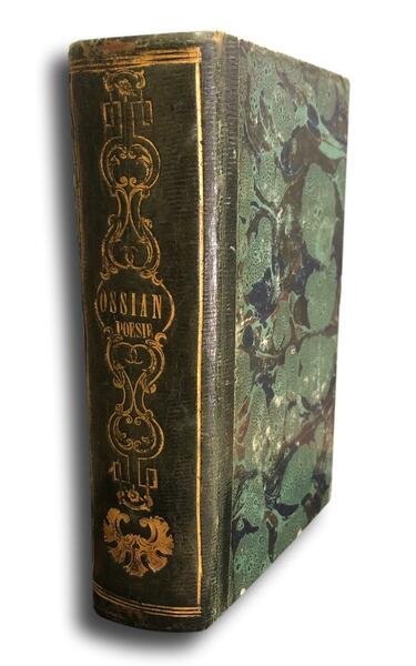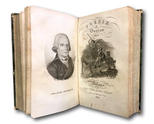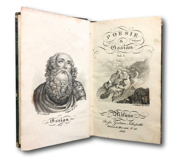 Milano, presso Gaetano Schiepatti, 1828. Traduzione di Malchiorre Cesarotti. Volume unico in formato tascabile che racchiude 2 tomi. Ritratto di Ossian allÕantiporta inciso da C.Cattaneo nel volume 1 e ritratto di Cesarotti nel volume 2. Varie vignette ai frontespizi, lievi arrossature e fioriture sparse, legatura dellÕepoca in mezza pelle verde e cartone marmorizzato ai piatti, fregi oro al dorso, pp 439+316. Poesia celtica, Irlanda, Preromanticismo