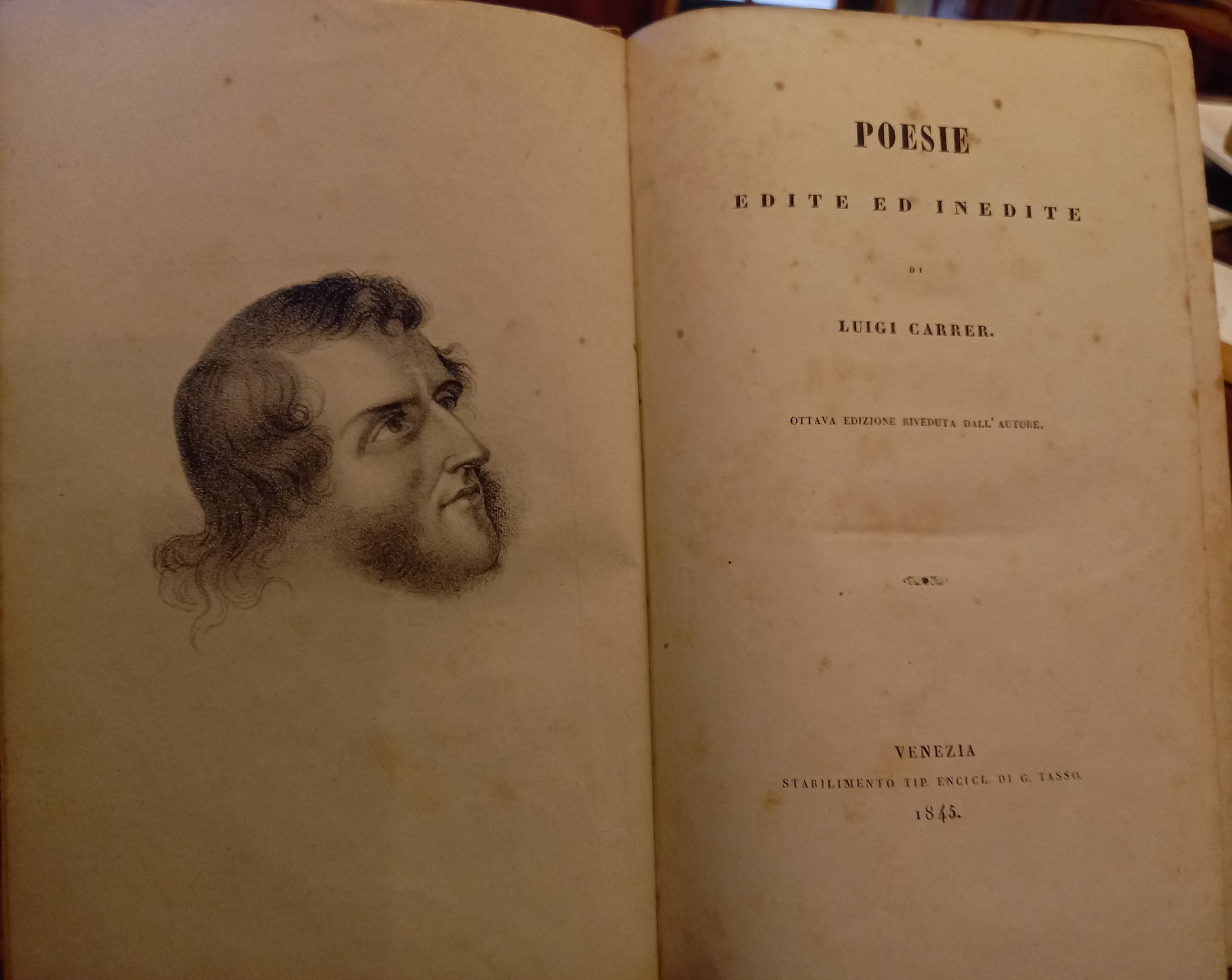 In-8 (21 cm) (1) c. (ritratto in antiporta) 477 (1). Mezza pelle. Piatti cartonati rivestiti di carta marmorizzata.Carrer Luigi (1801-1850): poeta, librettista, traduttore, scrittore, professore di filosofia, critico letterario. Nato e morto a Venezia.
