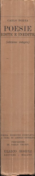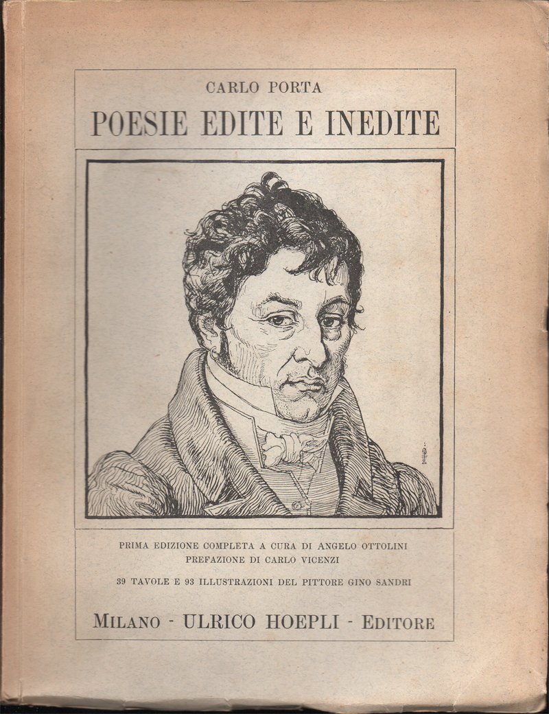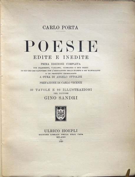 In-8° (24,9 x 19 cm), pp. XLIV, 537, (1), copertina editoriale. Alcune normali tracce d'uso e del tempo alla copertina, in particolare, nel bordo inferiore della copertina anteriore, qualche piccolo strappo, senza perdite, ben rimarginato con carta giapponese applicata alla seconda di copertina, e, al dorso, lievemente scurito, leggeri segni di piegatura longitudinale dovuti all'apertura del volume. Con 39 tavole fuori testo e 93 illustrazioni nel testo, in bianco e nero. Piccolo timbro nell'angolo superiore esterno della guardia anteriore; leggere arrossature, in particolare ai margini, dovute al tipo di carta, per il resto esemplare ben conservato. Indice. Indice delle poesie; Indice dei capoversi con l'indicazione delle stampe e dei manoscritti; Prospetto cronologico; Avvertenza di Angelo Ottolini; Prefazione di Carlo Vicenzi; Poesie; Glossario; Poesie libere. Titolo completo: Poesie edite e inedite. Prima edizione completa con frammenti, varianti, glossario, e due indici di cui uno dei capoversi con l'indicazione delle stampe e dei manoscritti e un prospetto cronologico. A cura di Angelo Ottolini. Prefazione di Carlo Vicenzi. 39 tavole e 93 illustrazioni del pittore Gino Sandri