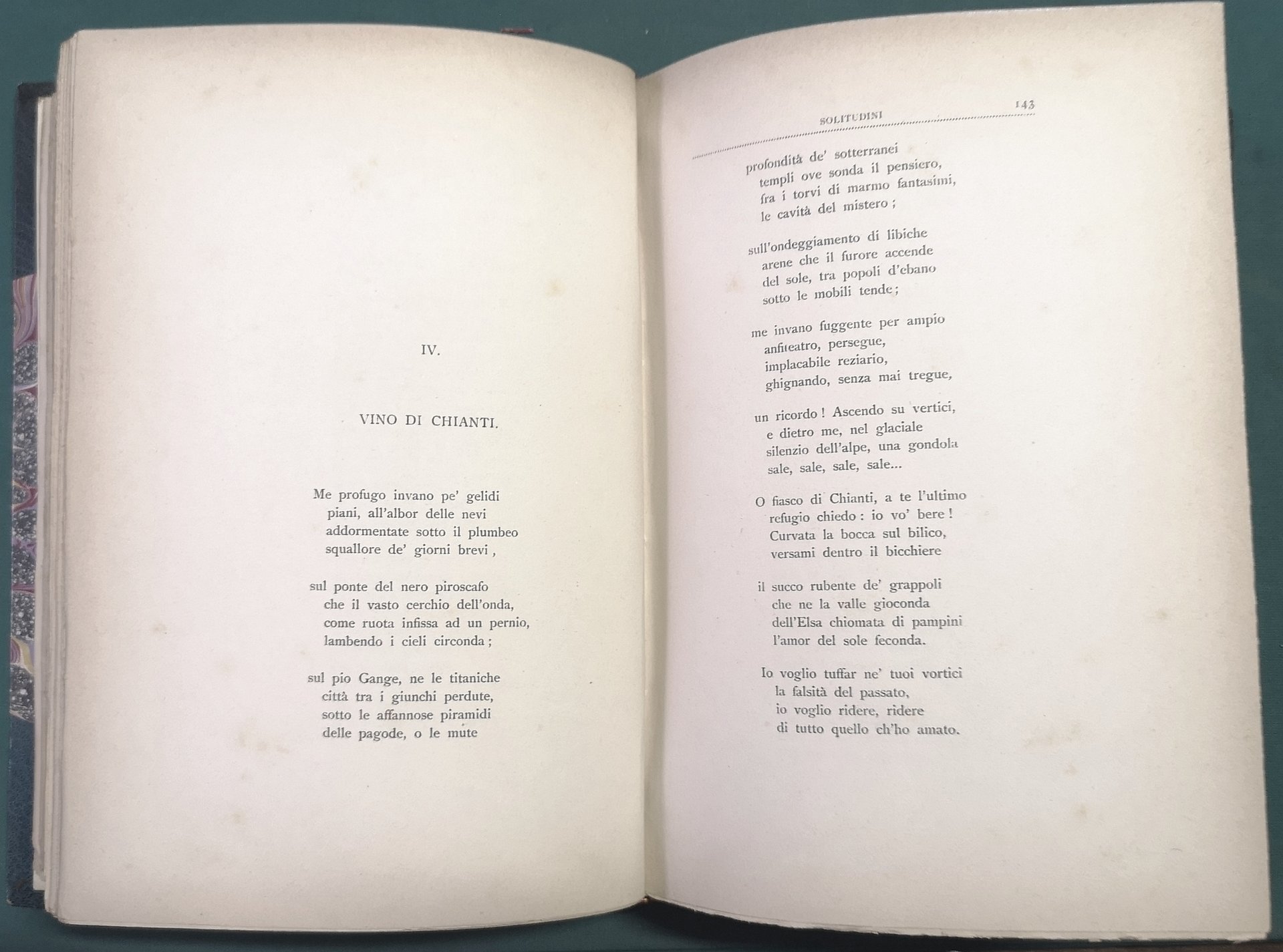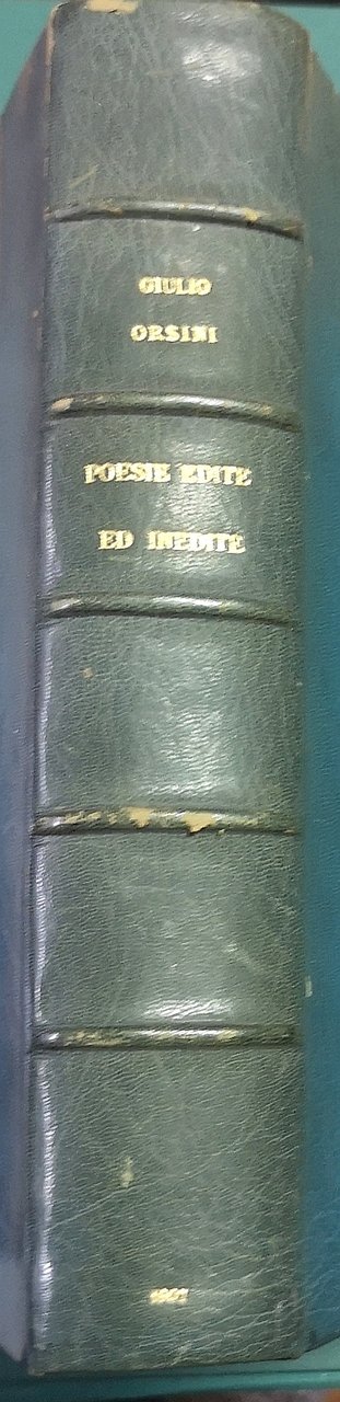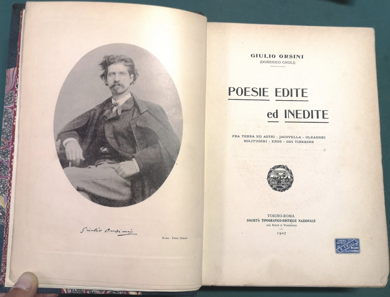 >in-4, pp. 384, ritratto fotografico dall'A. in antiporta. Legatura d'amatore in m. marocchino e angoli, filetti in oro sui piatti in carta decorata, titolo in oro su dorso a nervi. Broch. edit. conservate. Edizione originale, rara. Raccolta delle poesie complete di D. Gnoli (alias Giulio Orsini). Perfetto esemplare (timbro di libreria al frontespizio ed ex-libris all'occhietto).