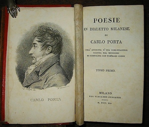 12mo (cm. 16), 2 Voll. legati in uno; 215(1) pp. con un ritratto dell’A. protetto da velina in antiporta (inciso da Caronni su disegno di Longhi); 227(1) pp. (segue) Idem, Raccolta di poesie inedite in dialetto milanese coll’aggiunta della Prineide e di alcune altre anonime, Italia, s.t. 1826, VIII-204 pp.(di 208, assente l’ultima carta dell’indice e la carta bianca finale) con un ritratto dell’A. protetto da velina in antiporta (inciso da Brodtmann su disegno di Longhi). Legatura coeva in mz. pelle rossa con fili, fregi e titolo impresso in oro al ds. Lievi sporadiche fioriture, più intense sui due ritratti. Scritta sulla prima carta bianca. Ex libris ‘Giorgio Nicodemi’ e timbretto araldico a secco sull’occhietto. Esemplare in ottimo stato di conservazione. Prima edizione postuma della prima opera in cui appaiono per la prima volta sia la biografia scritta da Tommaso Grossi sia la comi-tragedia sia numerose poesie.