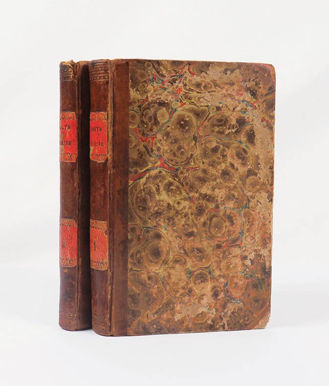 LIBROPrima edizione postuma, parzialmente originale. Qualche escoriazione ai piatti e alle cerniere, minime mancanze alla testa del dorso, fioriture, nel complesso un esemplare in condizioni più che buone. Discrete firme di antico possessore ai contropiatti anteriori e al contropiatto posteriore del primo volume.La prima edizione postuma delle poesie di Carlo Porta (morto il 5 gennaio 1821) si deve alle cure dell’amico fraterno Tommaso Grossi: la nuova raccolta era costituita da cinquantasei componimenti, di cui quaranta già usciti nell’edizione del 1817. Tra gli inediti, vale la pena ricordare il «Fraa Diodatt», «La nomina del cappellan» e «La preghiera», ormai considerati capolavori della letteratura italiana. Non meno rilevante è la comi-tragedia «Giovanni Maria Visconti Duca di Milano», qui stampata per la prima volta, importante testimonianza del sodalizio letterario e ideologico tra Porta e Grossi. Dati gli strettissimi tempi di consegna (l’incarico gli fu assegnato solo quindici giorni prima della messa in scena), Porta propose all’amico di realizzare il lavoro a quattro mani: «unitisi pertanto amendue a scegliere l’argomento, ad immaginare la condotta, ed a stabilire la divisione degli atti e delle scene, si divisero fra loro l’esecuzione; rivedendo poi insieme il complesso del lavoro, e stendendo anche alcune scene di compagnia» (nota «Al lettore», p. 79). L’opera non fu mai messa in scena, per «imprevedute circostanze» dice Grossi nella nota citata, il che significa per intervento della censura. Ma più che il prevedibile divieto, «stupisce l’audacia ai limiti dell’incoscienza dei due autori, che a un anno dall’infortunio della Prineide recapitavano al capo della polizia un copione incentrato su un tirannicidio, con tanto di apoteosi finale dei congiurati» (Novelli, «Divora il tuo cuore, Milano», p. 151). Il volume è aperto dai «Cenni intorno alla vita ed agli scritti di Carlo Porta» firmati da Grossi, prima biografia del poeta e tappa fondamentale nella ricezione della sua poesia: pur segnati da evidenti forzature — si pensi all’insistenza «sulla tempra integerrima del poeta cui non sarebbe stata estranea una religiosità sincera» — i Cenni sono mossi dalla volontà di sottrarre la produzione portiana alla damnatio memoriae di chi ne invocava una censura integrale, in un «tentativo non incomprensibile di salvarla dal rogo indiscriminato cui l’esponeva un grado di arditezza del tutto fuori scala» (ivi, p. 153; si veda anche Isella, Cinquant’anni, pp. 79-81). All’antiporta del volume I è stampato per la prima volta il celebre ritratto di Porta disegnato da Giuseppe Longhi, più volte riprodotto nelle edizioni successive. L’incisione fu affidata dapprima a Pietro Anderloni, che produsse però una tavola troppo grande per il formato del libro; l’editore si rivolse dunque a Paolo Caronni, il quale, «lieto di poter onorare la memoria del defunto suo amico, pose da canto tutti gli altri importanti lavori che ha fra le mani per attendere assiduamente a questo; sicchè in breve tempo lo ridusse a quella perfezione che tutti sapranno riconoscere» («Nota dell’editore», p. [216] del vol. I). Bibliografia Braidense, n. 4.Hoepli, (Milano), 299; Bibliografia delle edizioni portiane, n. 4.