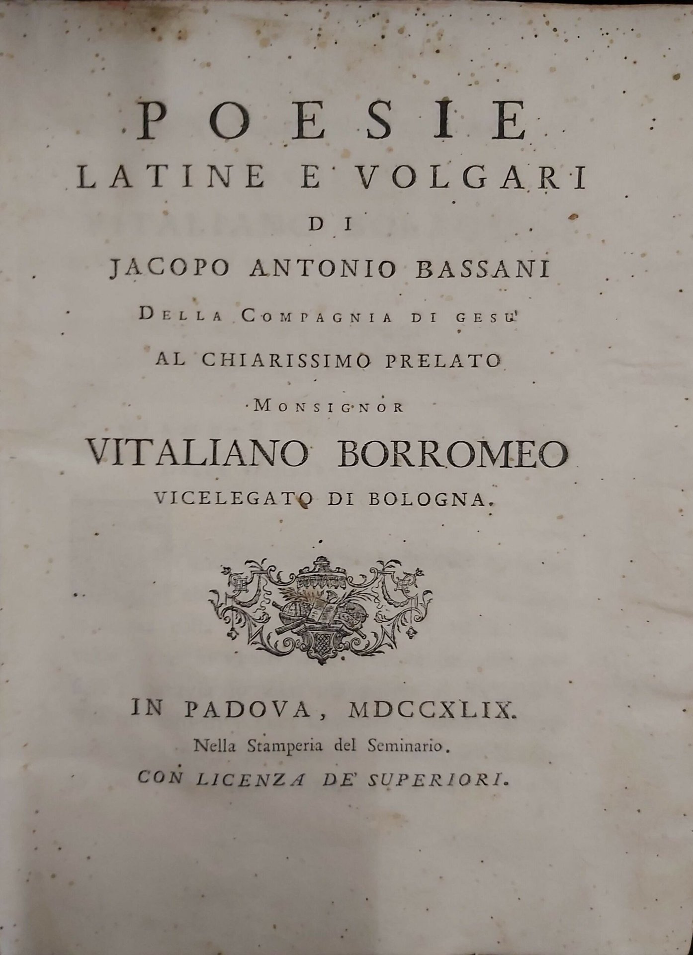 in-4, pp. (16), 113, leg. cart. rust. coevo, tagli color. Eleganti testat., final. e vignetta xilogr. al front. Presentazione dell’opera a cura di G. Battista Roberti che comprende la vita del Bassani. Le poesie sono dedicate a Frugoni, Zanotti, Zampieri, Colloredo, Papafava. Fra quelle in volgare di particolare interesse sono quelle dedicata alla città di Imola per la liberazione della peste, in lode dei giocatori di pallone, per la vittoria dei Veneziani sui Turchi, al Vallisneri. L’opera principale del B. veneziano, ma vicentino di adozione. Rumor I, 88. Belliss. esempl.