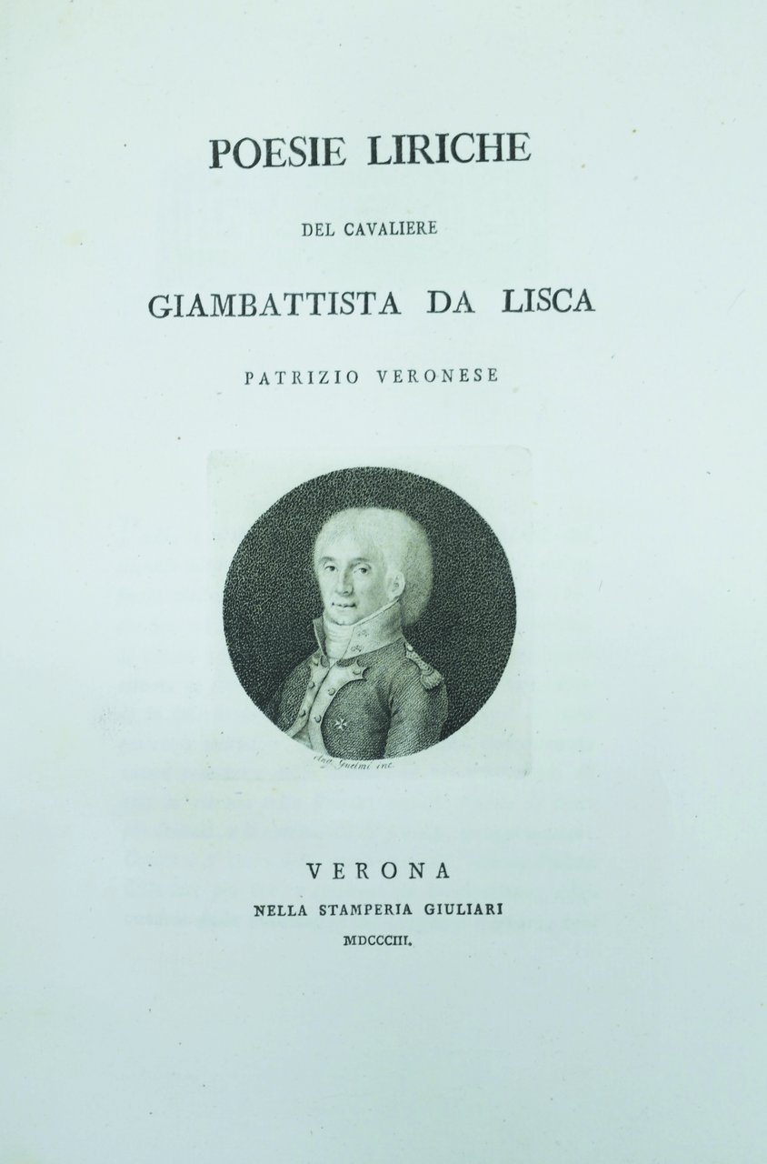 In-4 p. (mm. 300 x 221), 3 opere in 1 volume, mz. pergamena con ang., fregi e titolo oro su tassello al dorso, pp. 172, frontespizio con ritratto in tondo dell'A., inc. in rame da Guelmi, e 11 pregevoli testate e finalini, pure inc. in rame. Vi sono contenuti: Canzoni, Epigrammi, Madrigali, Odi, Sciolti, Sonetti e Stanze. Unito a: "Epistola" del Capitan Ingegnere Girolamo Francesco Cristiani indiritta al chiarissimo Cavaliere Giambattista Da Lisca, patrizio veronese. Verona, Giuliari, 1804, pp. 16, testo entro cornice, inciso in rame. Unito a: "La Calunnia" (del Cav. Da Lisca). Versi. Verona, Giuliari, 1805, pp. 45,(3), con ritratto in tondo dell'A. all'antiporta, testo entro cornice, il tutto inc. in rame.Elegante pubblicazione di notevole pregio tipografico. Solo prime 8 carte con lieve alone al bordo infer., altrimenti bell'esemplare con barbe, a grandi margini.