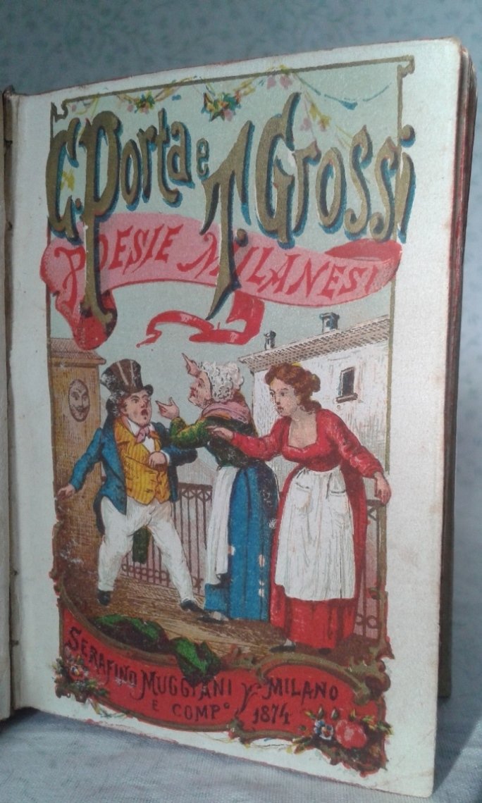 Volume in 16, magnifica legatura amatoriale in piena pergamena, dorso finemente impresso ai piccoli ferri e decorato in oro, titolo inciso in oro al tassello in pelle rossa, sguardie ornamentali, bianca, brossura editoriale figurata in policromia, perfettamente conservata, occhiello, antiporta con vignetta incisa, frontespizio (una firma di possesso in bella grafia a margine), cenni biografici dei due autori, 574 pp., numerose spassosissime vignette incise a piena pagina n.t., bianche finali. Pregevole e piacevolissima edizione delle poesie dialettali dei due poeti milanesi tra cui, la comi-tragedia 'Giovanni Maria Visconti, Duca di Milano' (che fu il primo esempio in Italia di collaborazione teatrale a due). Edizione ormai poco comune, ancor pi in cos bello stato di conservazione ed elegante veste legatoriale. Un vero gioiello da collezione.