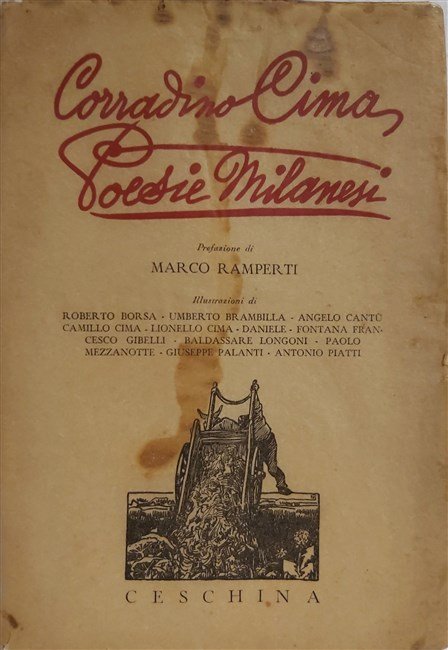 in-8, pp. 318, (4), bross. edit. con sovracop. ill. Bella ediz. di poesie dialettali accompagnate da tavv. di illustrazioni di Roberto Borsa, Umberto Brambilla, Angelo Cantù, Camillo Cima, Lionello Cima, Daniele Fontana, Francesco Gibelli, Baldassare Longoni, Paolo Mezzanotte, Giuseppe Palanti, Antonio Piatti. Noto cultore della parlata milanese, Corradino Cima compose molte poesie tanto famose da diventare quasi proverbi, fu anche musicista. [312]